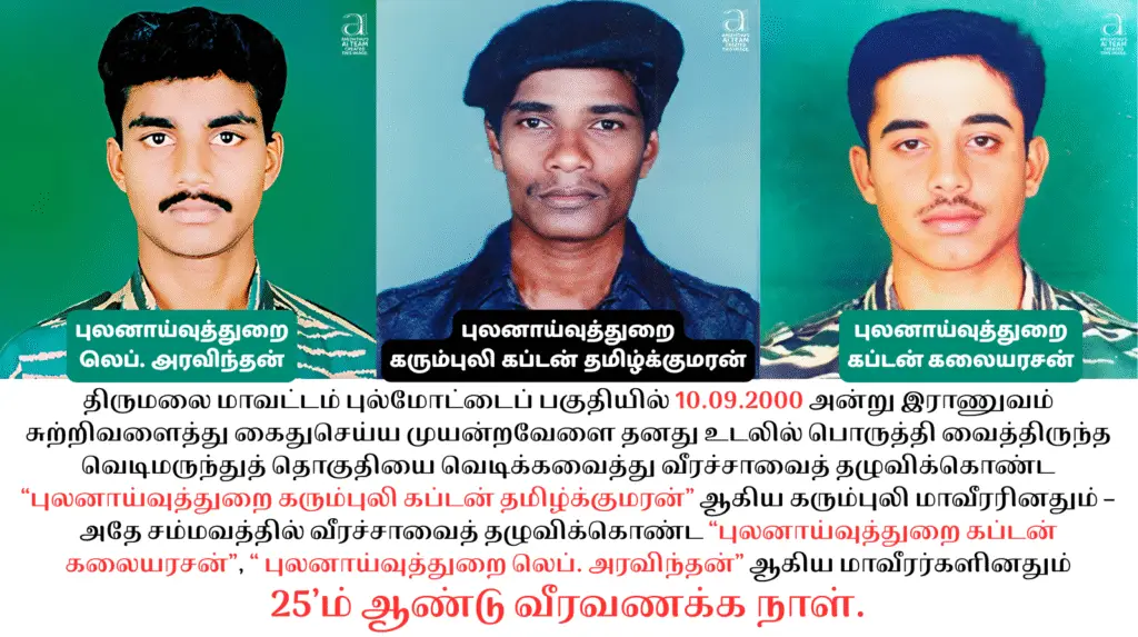 தமிழீழம் புலனாய்வுத்துறை மாவீரர்களின் 25’ம் ஆண்டு வீரவணக்க நாள் | 10.09.2000 10 September, 2025 தமிழீழம். புலனாய்வுத்துறை லெப்டினன்ட் அரவிந்தன் | 10.09.2000 புலனாய்வுத்துறை கரும்புலி கப்டன் தமிழ்க்குமரன் | 10.09.2000 புலனாய்வுத்துறை கப்டன் கலையரசன் | 10.09.2000 “மாவீரர்களின் நினைவுகள் வரலாற்றுச் சின்னங்களாக என்றென்றும் நிலைத்து நிற்க வேண்டும் ”- தமிழீழத் தேசியத் தலைவர். “புலிகளின் தாகம் தமிழீழத் தாயகம்” Post navigation Previous: லெப்.கேணல் பாவரசன் உட்பட ஏனைய மாவீரர்களின் வீரவணக்க நாள்Next: “இலங்கையில் வெளிநாட்டு தலையீடு பிரிவினையை உருவாக்கும்” – ஐ.நா மனித உரிமைகள் கவுன்சிலில் சீனா தொடர்புடைய இடுகைகள் ✍🏻 குருதிச் சுவடுகள் தமிழீழம் மாவீரர்கள் லெப்.கேணல் தமிழ்மாறன் 22 October, 2025 English News தமிழீழம் முதன்மை செய்திகள் Ellalan operation on the Sri Lanka Air Force Base in Anuradhapura – 22 October 2007 22 October, 2025 அகவை வாழ்த்து தமிழீழம் அகவை வாழ்த்து – அக்டோபர் 22 22 October, 2025 Leave a Reply Cancel replyYour email address will not be published. Required fields are marked *Comment * Name * Email * Website Save my name, email, and website in this browser for the next time I comment.