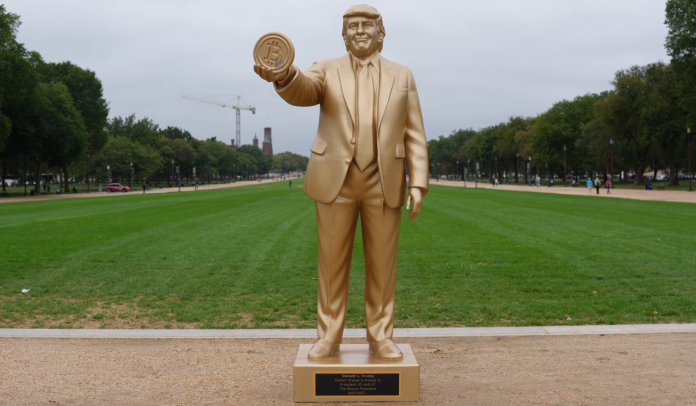 அமெரிக்க தலைநகர் வாஷிங்டனில் உள்ள பார்லிமென்டுக்கு வெளியே, நேஷனல் மால் பகுதியில் கையில் பிட்காயின் ஏந்தியபடி இருக்கும் டிரம்பின் 12 அடி உயர பொன்நிற சிலை நிறுவப்பட்டுள்ளது. இச்சிலை மக்களின் கவனத்தை ஈர்த்துள்ளதுடன், பல்வேறு விவாதங்களையும் கிளப்பியுள்ளது.