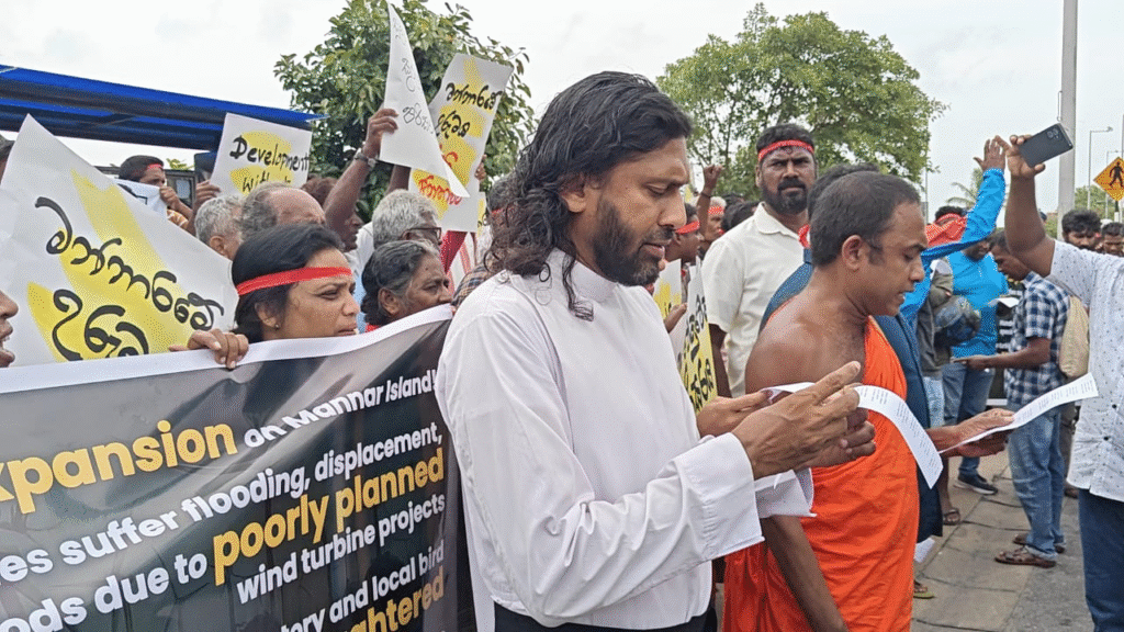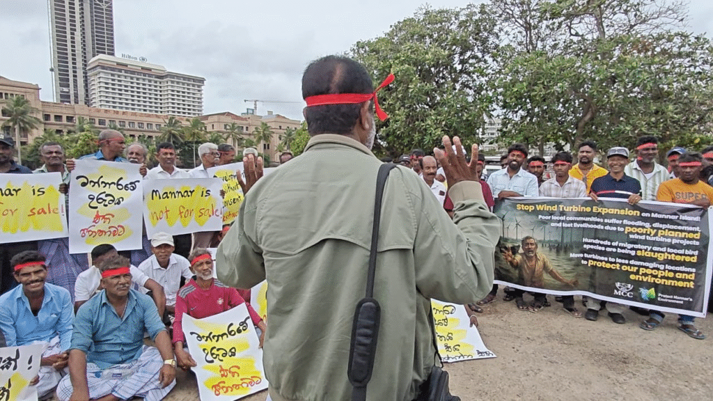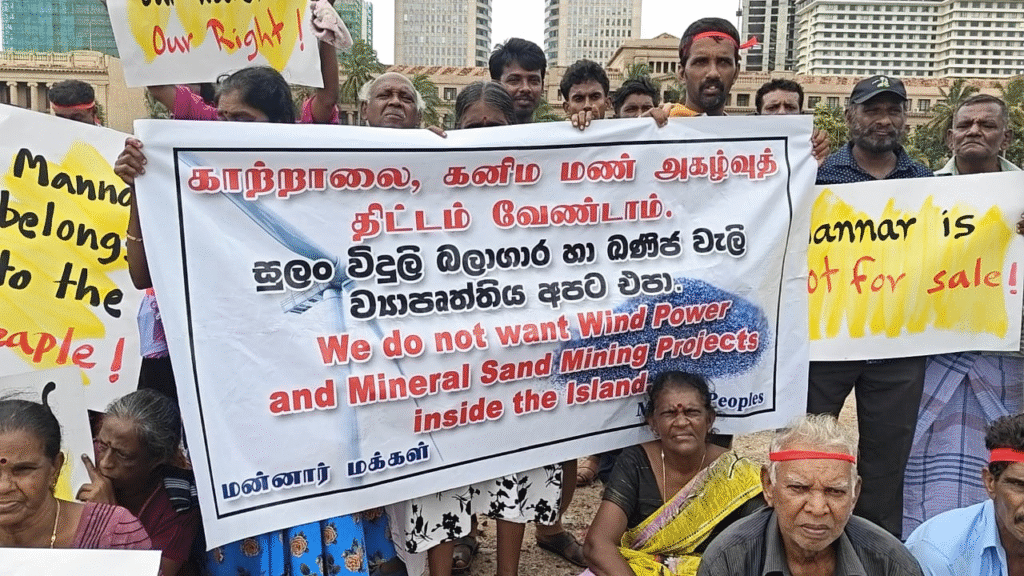மன்னார் காற்றாலை திட்டத்திற்கு எதிர்ப்பு தெரிவித்து மன்னாரில் இருந்து சுமார் 500க்கும் மேற்பட்ட பொதுமக்கள் வருகை தந்து கொழும்பு ஜனாதிபதி செயலகத்திற்கு முன்பாக போராட்டமொன்றை முன்னெடுத்துள்ளனர்.