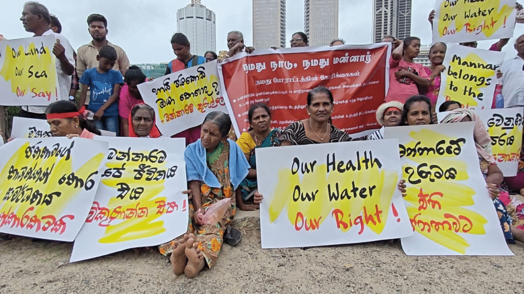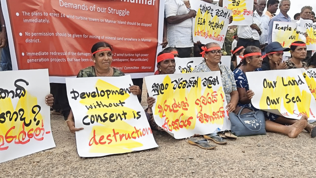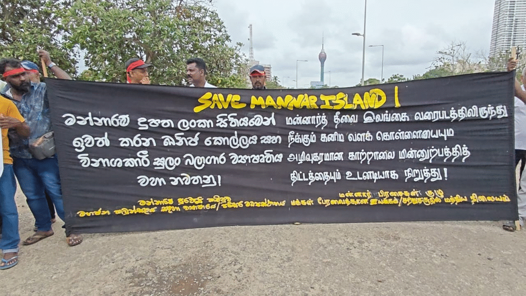 “நமது நாடு, நமது மன்னார், நமது போராட்டத்தின் கோரிக்கைகள்” என்ற பதாகையில்