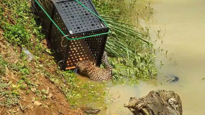சுமாா் 3 மணி நேர போராட்டத்துக்குப் பின்னா் சிறுத்தையை உயிருடன் பாதுகாப்பாக வலையில் போட்டு மீட்டனர்.