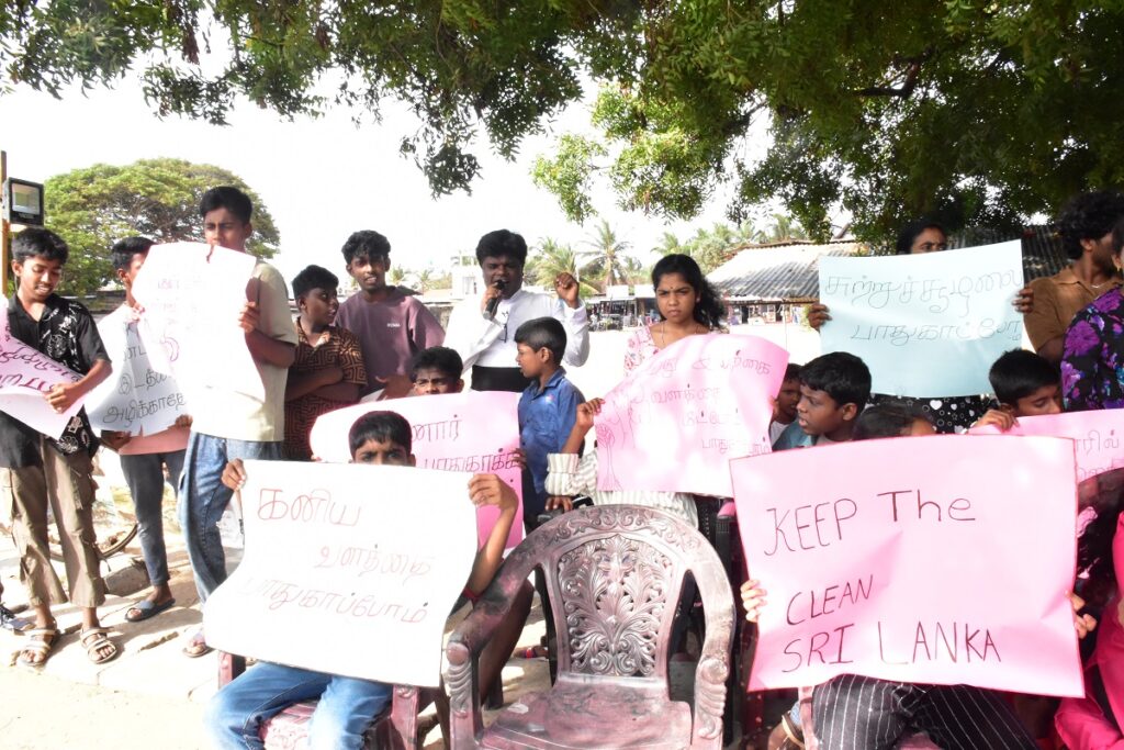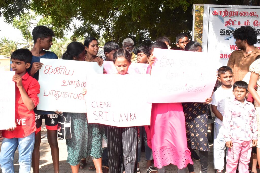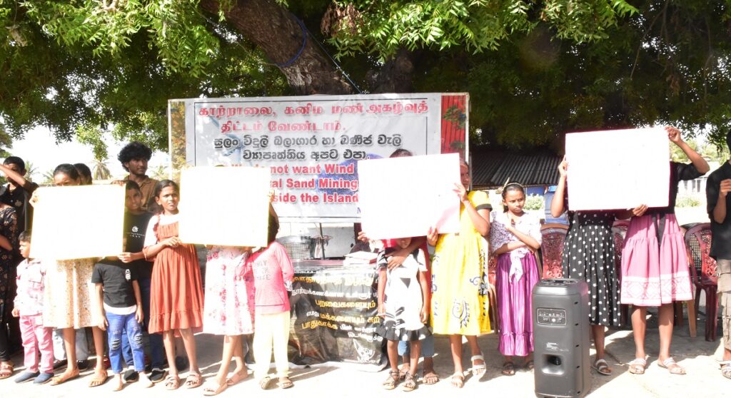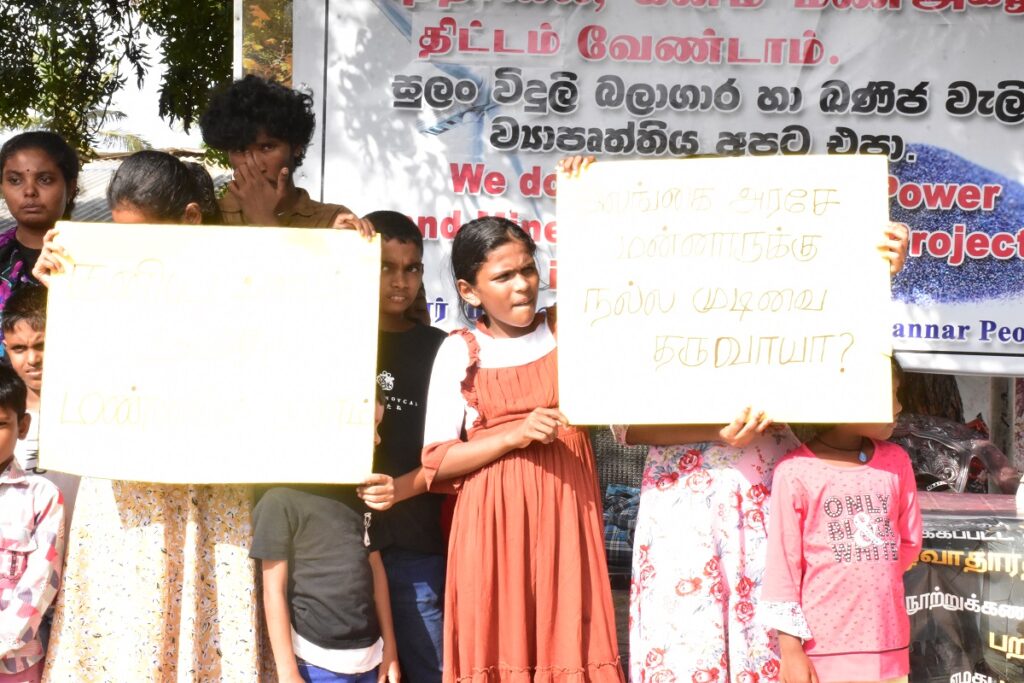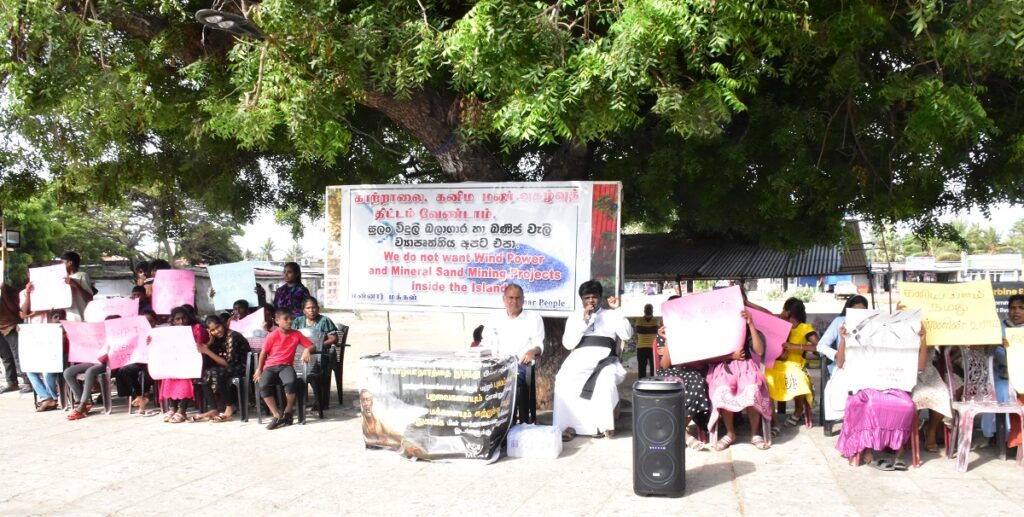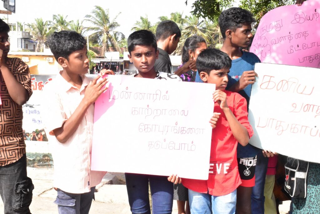 போராட்டத்தில் ஈடுபட்ட இளையோர் காற்றாலை மற்றும் கனிய மணல் அகழ்வுக்கு எதிராக எழுதப்பட்ட பல்வேறு வாசகங்கள் அடங்கிய பதாகைகளை ஏந்தியவாறு போராட்டத்தில் ஈடுபட்டனர்.