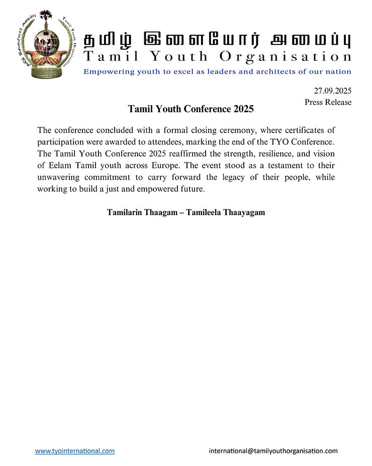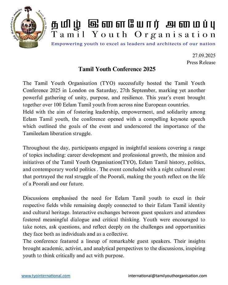 The Tamil Youth Organisation (TYO) successfully hosted the Tamil Youth Conference 2025 in London on Saturday, 27th September, marking yet another powerful gathering of unity, purpose, and resilience. This year’s event brought together over 100 Eelam Tamil youth from across nine European countries.