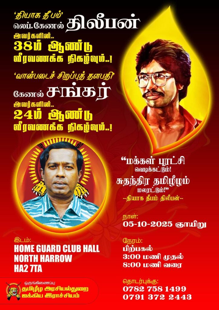 நிகழ்வுகள் பிரித்தானியா புலம்பெயர் தமிழர்கள் வீரவணக்க நிகழ்வு – தமிழீழ அரசியல்துறை ஐக்கிய இராச்சியம் 5 October, 2025 வீரவணக்க நிகழ்வு – பிரிட்டன் | 05.10.2025 Post navigation Previous: மூதூரில் உள்ள மெங்காமம் கிராமத்திற்குள் நுழைந்த காட்டு யானை, வீட்டுத் தோட்டப் பயிர்களை சேதப்படுத்தியது – மக்கள் கவலை.Next: மன்னார் காற்றாலை மின்னுற்பத்தித் திட்டத்தை உடன் இடைநிறுத்துங்கள். – ஆசியப்பேரவை வலியுறுத்தல் தொடர்புடைய இடுகைகள் ✍🏻 நிகழ்வுகள் புலம்பெயர் தமிழர்கள் முதன்மை செய்திகள் தமிழீழத் தேசிய மாவீரர் நினைவாக நடாத்தப்பெறும் கவிதைப்போட்டி & பேச்சுப்போட்டி 2025 – சுவிஸ் 21 October, 2025 நிகழ்வுகள் புலம்பெயர் தமிழர்கள் லெப்.கேணல் நாதன் & கப்டன் கஜன் ஆகியோரின் 29’ம் ஆண்டு நினைவேந்தல் நிகழ்வு – பிரான்சு 20 October, 2025 புலம்பெயர் தமிழர்கள் முதன்மை செய்திகள் இறுதி அஞ்சலி அறிவித்தல் “அமரர் யோகராசா சிறிஸ்கந்தராசா” 19 October, 2025 Leave a Reply Cancel replyYour email address will not be published. Required fields are marked *Comment * Name * Email * Website Save my name, email, and website in this browser for the next time I comment.