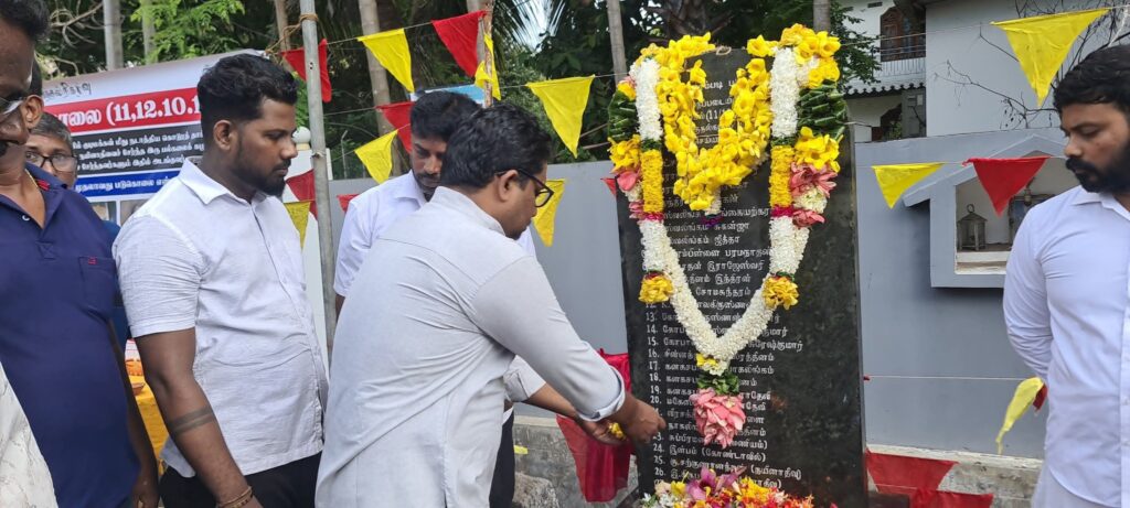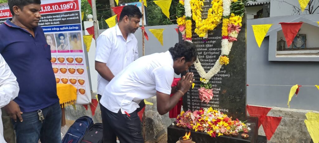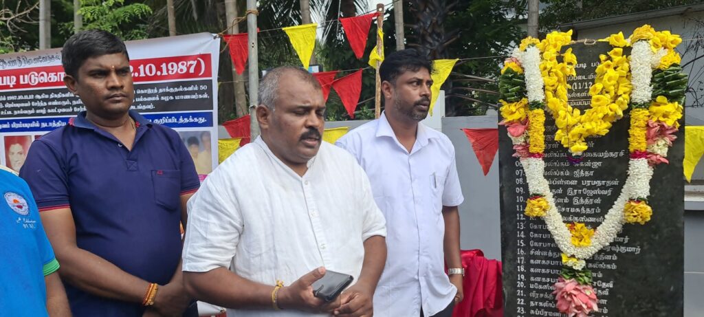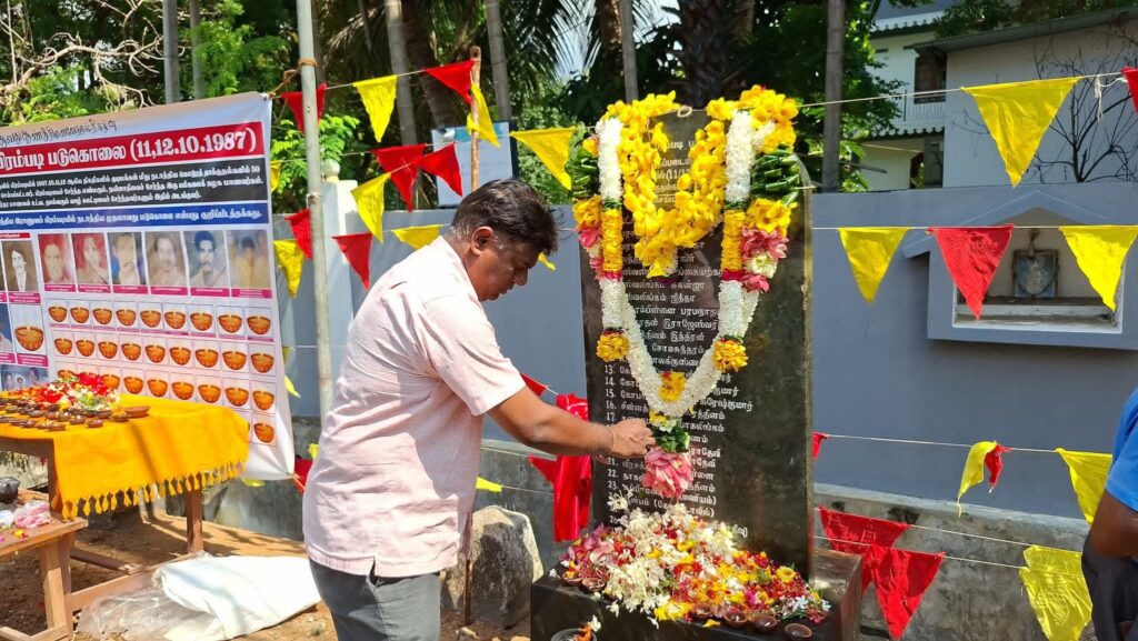 இந்திய இராணுவத்தினரால் படுகொலை செய்யப்பட்டவர்களின் நினைவாக பிரம்படி சந்தியில் அமைக்கப்பட்டுள்ள நினைவு தூவியில் சுடரேற்றி மலர் அஞ்சலி செலுத்தப்பட்டது.