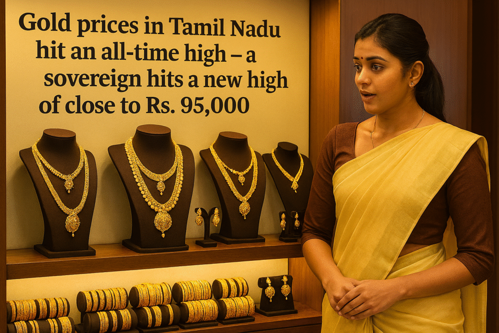 தமிழ்நாட்டில் தங்கத்தின் விலை வரலாறு காணாத உச்சத்தை எட்டியது – ஒரு சவரன் ரூ.95,000 ஐ நெருங்கி புதிய உச்சத்தை எட்டியது.