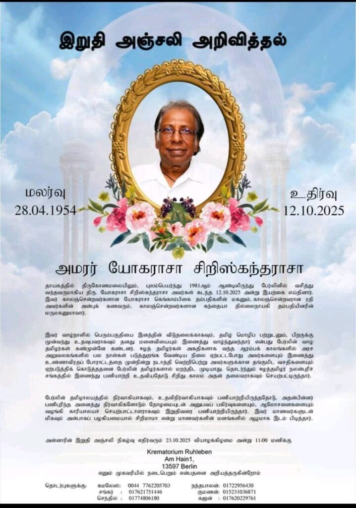 தாயகத்தில் திருகோணமலையிலும், புலம்பெயர்ந்து 1981ஆம் ஆண்டிலிருந்து பேர்லினில் வசித்து வந்தவருமாகிய திரு. யோகராசா சிறிஸ்கந்தராசா அவர்கள் கடந்த 12.10.2025 அன்று இயற்கை எய்தினார்.