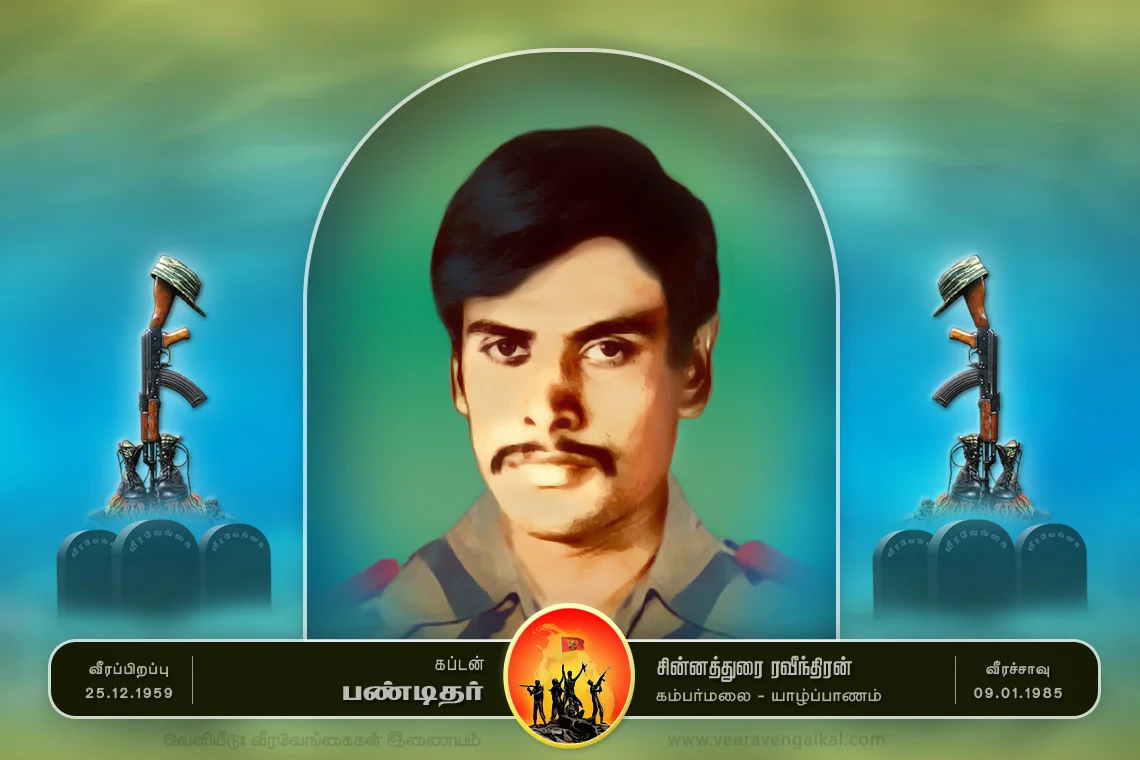 வல்வெட்டித்துறைக்கு அருகேயுள்ள கம்பர்மலையைப் பிறப்பிடமாகக் கொண்ட இவருக்கு அகவை 24. 1977ஆம் ஆண்டு புலிகள் இயக்கத்தில் சேர்ந்து இயக்க வளர்ச்சிக்கு அயராது உழைத்தார். கடமையுணர்வு, கடும் உழைப்பு, இலட்சியப்பற்று ஆகிய சீரிய பண்புகள் நிறைந்த கப்டன் ரவீந்திரன், விடுதலைப் போராளிகளின் அன்புக்கும் மதிப்பிற்கும் பாத்திரமாக விளங்கினார். தமிழீழ விடுதலைப் புலிகளின் தலைவர் வே. பிரபாகரனுக்கு மிகவும் வேண்டியவராக, அவரது வலது கையாகத் திகழ்ந்தார். இயக்க நிர்வாகப் பொறுப்புக்களைச் சுமந்து வந்ததோடு மட்டுமல்லாது, கெரில்லாத் தாக்குதல் நடவடிக்கைகளிலும் இவர் பங்குபற்றி வந்தார். ஈழத் தமிழ் மக்களின் சுதந்திரத்திற்காகத் தனது உயிரை அர்ப்பணித்துக்கொண்ட இந்த வீர மறவனுக்கு, விடுதலைப் புலிகள் தமது வீரவணக்கத்தைச் செலுத்துகின்றனர்.
