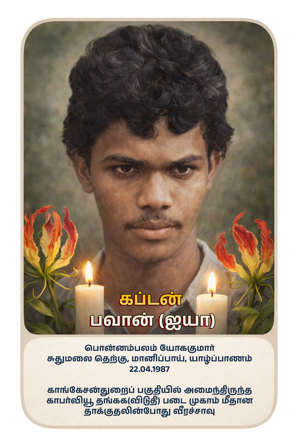 வீரச்சாவு நிகழ்வு விபரம்: காங்கேசன்துறைப் பகுதியில் அமைந்திருந்த காபர்வியூ தங்கக (விடுதி) படை முகாம் மீதான தாக்குதலின்போது வீரச்சாவு.