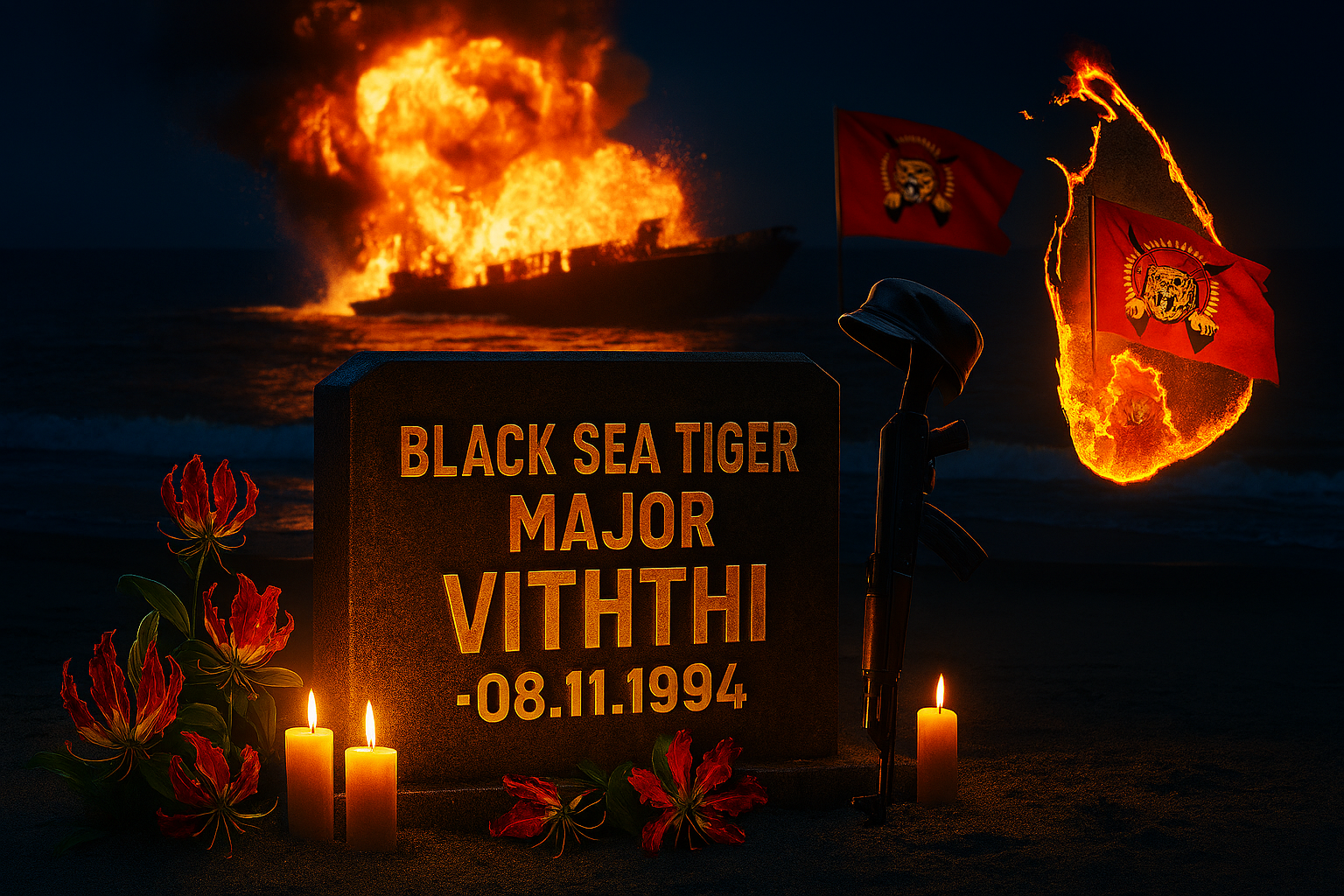 வெற்றிலைக்கேணி என்றதும் விடுதலைப் புலிகளே நினைவுக்கு வருவர்; மண்ணை ஏறி மிதித்து நடந்த எதிரிப் படையினர் மீதொரு புயலாய் நின்று எதிர்த்த வரலாற்றின் நினைவு விரியும். காற்றின் வெளியில் கைகளை ஊயரத்தி வீரம் உரைத்த கதை எழும். உப்பு வெளியிலும், வீசும் உப்புக் காற்றிலும் வீரர் இறுதி மூச்சொலிக்கும். அந்த வெற்றிலைக்கேணியில் சிறிலங்கா கடற்படை இராணுவத் தளபாடங்களை இறக்கிக் கொண்டிருந்தது. சிறிலங்காவிற்குச் சொந்தமான தரையிறங்கும் போர்க்கப்பலை நோக்கி கடற் கரும்புலி மேஜர் வித்தி சென்றான். வெடிமருந்தேற்றிய படகில் ஊடுருவிச் சென்றான். அதோ அந்தக் கப்பலின் மீது மோதிச் சாய்த்தான். எரிமலைப் பிழம்பென எங்கும் சோதி பரப்பி கங்குல் கிழித்தான் காவியநாயகன்; எங்களின் கடற்கரும்புலி மேஜர் வித்தி. புதிய காவியம் எழுதினான்.