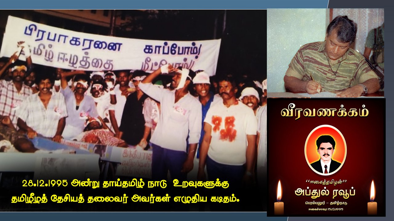 சிங்கள இனவாத ஆட்சியாளரின் கொடுமையால், இன அழிப்பின் விளிம்பில் நின்று. விடுதலைக்காகப் போராடி வரும் ஈழத்தமிழினத்திற்காக உணர்வு பூர்வமாக உரிமைக் குரல் எழுப்பும் தமிழக மக்களுக்கும் தமிழகத் தலைவர்களுக்கும் எமது மக்களின் சார்பில் அன்பையும், நன்றியையும் தெரிவிக்க விரும்புகின்றேன். ஈழத்தமிழருக்கு இன்னல் நிகழும் பொழுதெல்லாம் தமிழகத்திலிருந்து எழும். அனுதாப உணர்வலைகள், ஈவிரக்கமற்ற எமது எதிரிக்கு ஒரு அச்சுறுத்தலாக அமைவதுடன் நொந்து போயிருக்கும் எமது மக்களுக்கு ஆறுதலையும், நம்பிக்கையையும் தருகிறது. அத்துடன் ஈழத்தமிழினம் நிராதரவாகத் தனித்து நிற்கவில்லை என்ற உண்மையையும் உலகத்திற்கு எடுத்து இயம்புகிறது. தமிழீழமக்களின் நீண்ட காலமாக எமது மண்ணில் இனக்கொலை நடந்து வருகிறது. இந்த நீண்ட நாற்பது ஆண்டு கால இன ஒழிப்பு வரலாற்றில் எமது மொழி, பண்பாடு, கல்வி, எமது பொருளாதார வாழ்வு என்ற ரீதியில் எமது தேசிய வாழ்விற்கு ஆதாரத் தூண்களாக நிற்கும் அனைத்துமே திட்டமிட்டுச் சிதைக்கப்பட்டு வந்துள்ளன. சிங்கள இனவாதப்பூதம் எமது தாயக மண்ணைப் படிப்படியாக ஏப்பம் விட்டு வருகிறது. வரலாற்றுப் புகழ்மிக்க எமது நகரங்களையும், பட்டினங்களையும், சிங்கள் ஆயுதப்படைகள் ஆக்கிரமித்து நிற்கின்றன. பல இலட்சம் மக்கள் தமது சொந்த மண்ணிலிருந்து ஏதிலிகளாக இடம்பெயர்ந்துள்ளனர். இரத்தம் படிந்த இந்தச் சோக வரலாற்றில் நாற்பதினாயிரத்திற்கும் மேற்பட்ட தமிழர்கள் சாவைச் சந்தித்திருக்கிறார்கள். இந்தக் கொடூரமான இனக்கொலை வரலாற்றின் தொடர்ச்சியாகவும் பூதாகர விரிவாக்கமுமாகவே இன்றைய போர் நிகழ்ந்து வருகிறது,