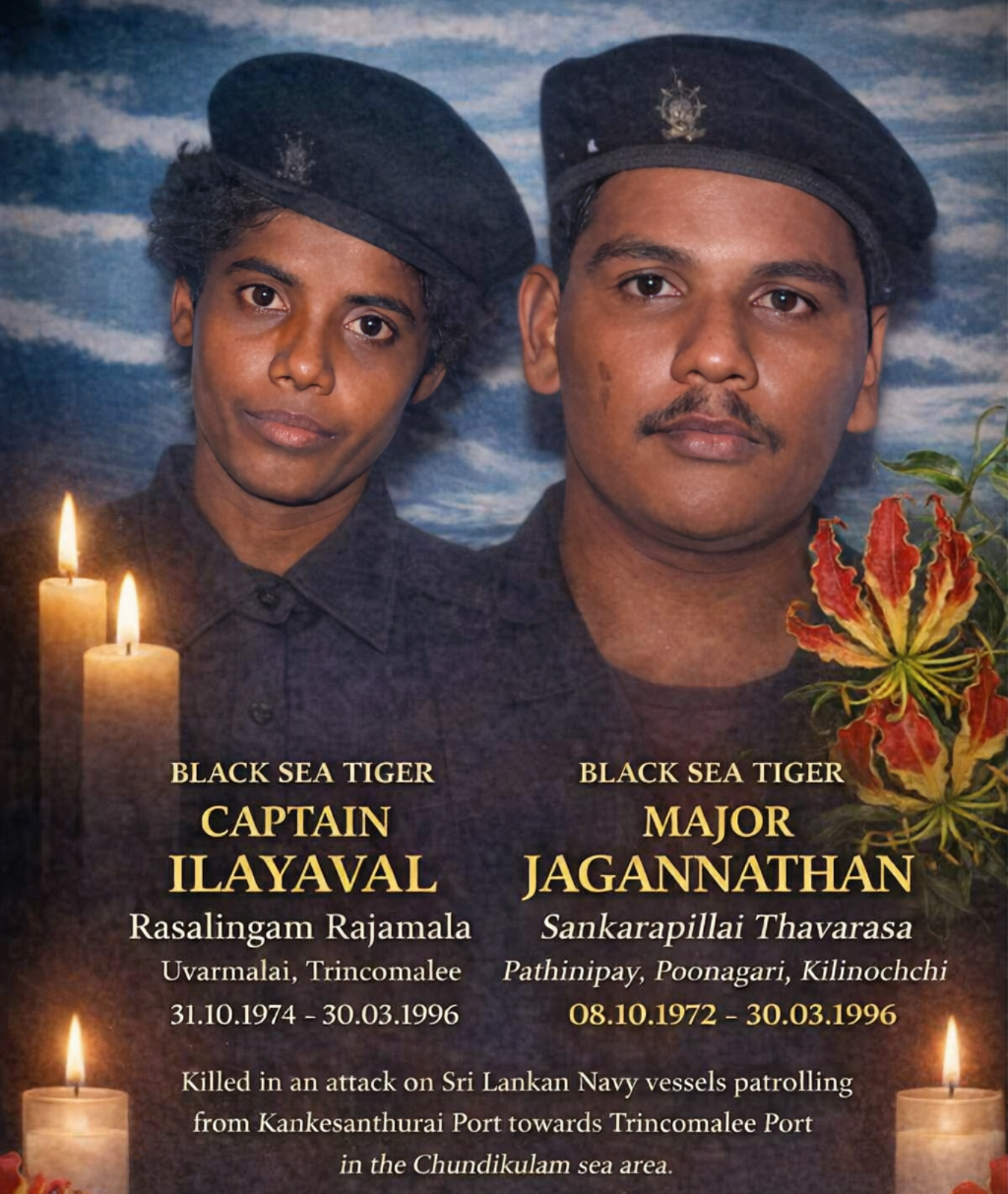 யாழ் மாவட்டம் காங்கேசன்துறைத் துறைமுகத்திலிருந்து திருகோணமலை துறைமுகத்தை நோக்கி 30.03.1996 அன்று ரோந்து சென்ற சிறிலங்கா கடற்படையின் கடற்கலம் கொண்ட அணியினரை யாழ் மாவட்டம் சுண்டிக்குளக் கடற்பரப்பில் வழிமறித்து சிறிலங்கா கடற்படை அணியின் அதிவேக டோறாப் பீரங்கிக் கலம் மூழ்கடித்த கரும்புலித் தாக்குதலில் வீரச்சாவைத் தழுவிக்கொண்ட கடற்கரும்புலி மேஜர் ஜெகநாதன், கடற்கரும்புலி கப்டன் இளையவள் ஆகிய கடற்கரும்புலி உயிராயுதங்கள்.