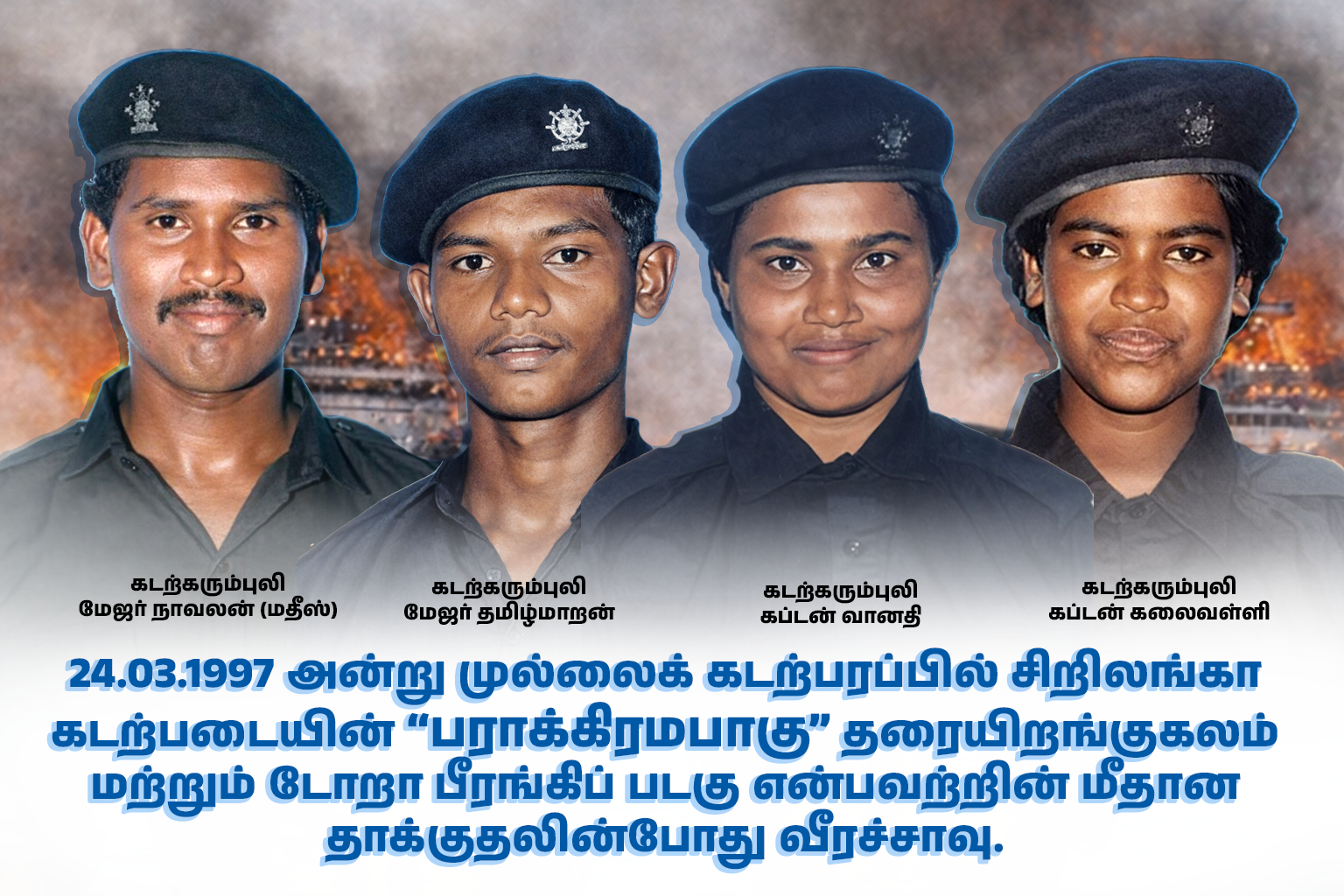 முல்லை கடற்பரப்பில் 24.03.1997 அன்று சிறிலங்கா கடற்படையின் “பராக்கிரமபாகு” கப்பல் மீதான கரும்புலித் தாக்குதலில் வீரச்சாவைத் தழுவிக்கொண்ட கடற்கரும்புலி மேஜர் நாவலன், கடற்கரும்புலி மேஜர் தமிழ்மாறன், கடற்கரும்புலி கப்டன் கலைவள்ளி, கடற்கரும்புலி கப்டன் வானதி ஆகிய கரும்புலிகள்.