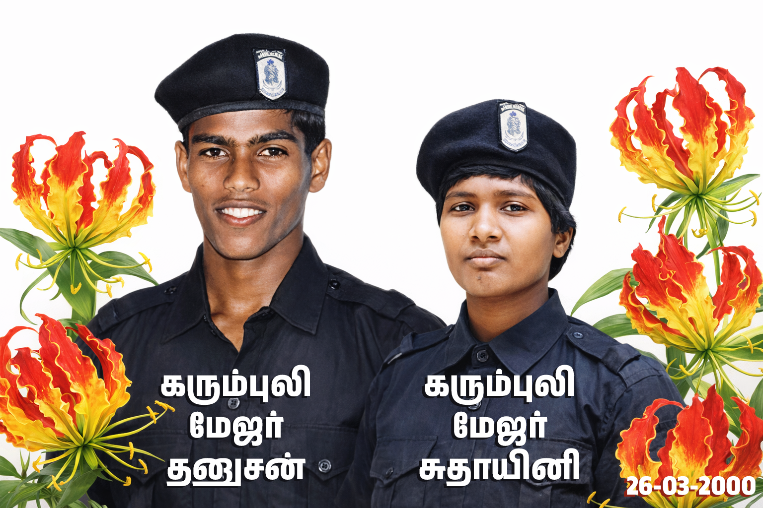 யாழ். மாவட்டம் பளைப் பகுதியில் ஓயாத அலைகள் 03 படை நடவடிக்கையின் போது 26.03.2000 அன்று சிறிலங்காப் படைகளின் ஆட்லறித் தளத்தைக் கைப்பற்றி அழித்த கரும்புலித் தாக்குதலில் வீரச்சாவைத் தழுவிக்கொண்ட கரும்புலி மேஜர் தனுசன், கரும்புலி மேஜர் சுதாஜினி ஆகிய கரும்புலிகள்.