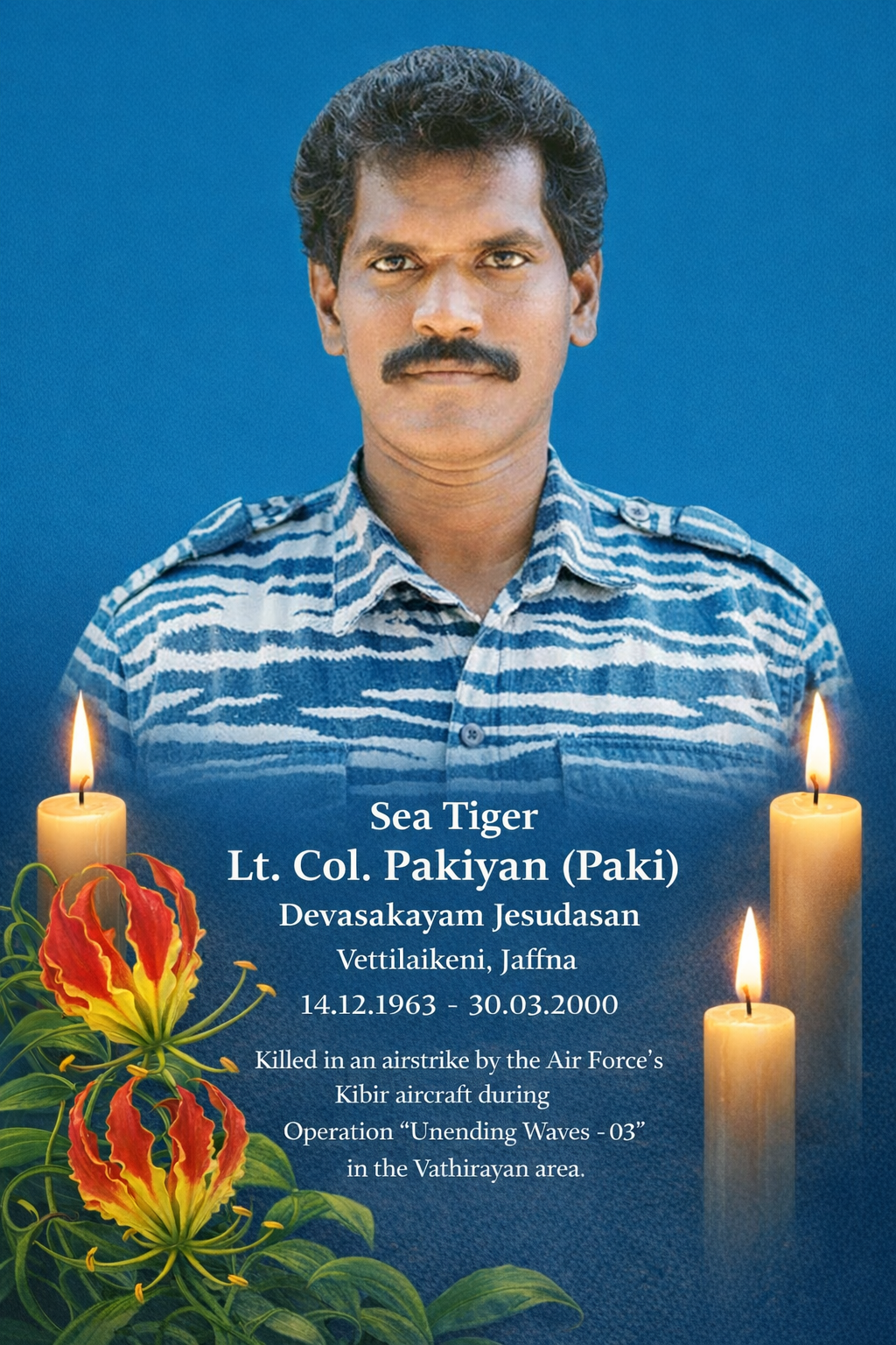 இன்று இவரின் பிரிவைத் தாங்காது தவிக்கும் மனைவி, குழந்தை, உறவினர்கள் அனைவருடன் அவர்களின் துயரில் பங்குகொள்வதுடன் கடற்புலிகளின் சார்பிலும், எனது சார்பிலும் கடல்மறவன் லெப். கேணல் பாக்கிக்கு எனது வீர வணக்கத்தையும் தெரிவித்துக்கொள்ளுகின்றேன்.