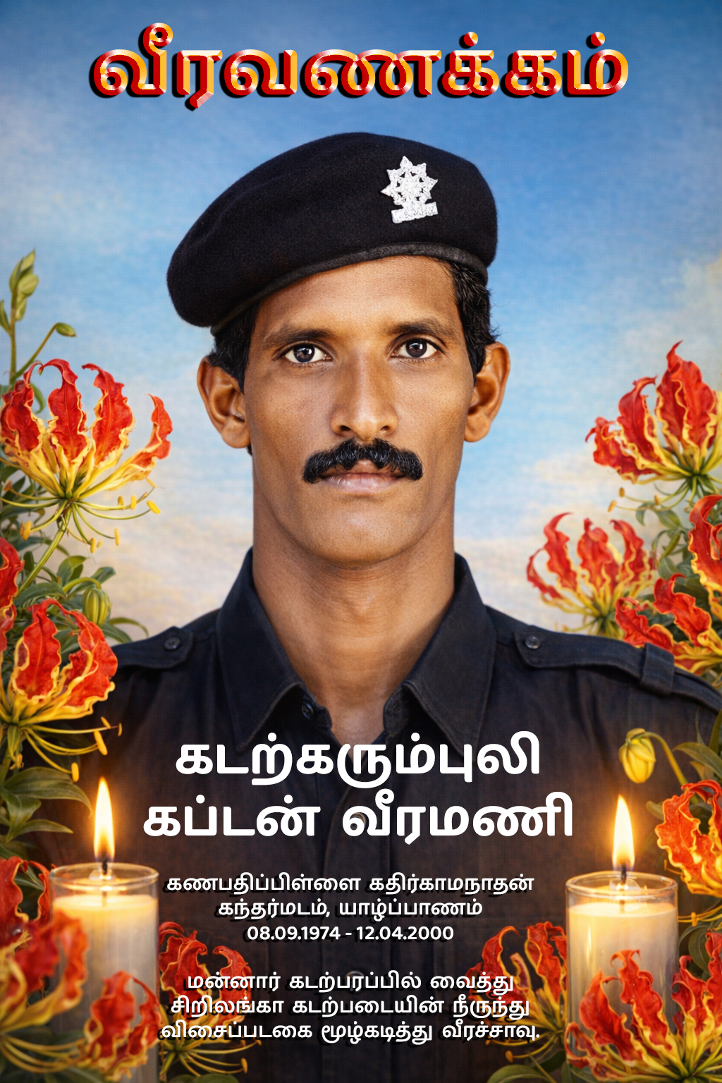 மன்னார் மாவட்டம் கற்பிட்டிக் கடற்பரப்பில் 12.04.2000 அன்று சிறிலங்கா கடற்படையினரின் நீருந்து விசைப்படகு மூழ்கடித்த கரும்புலித் தாக்குதலில் வீரச்சாவைத் தழுவிக்கொண்ட கடற்கரும்புலி கப்டன் வீரமணி ஆகிய கடற்கரும்புலி மாவீரரின் நினைவுகளோடு..