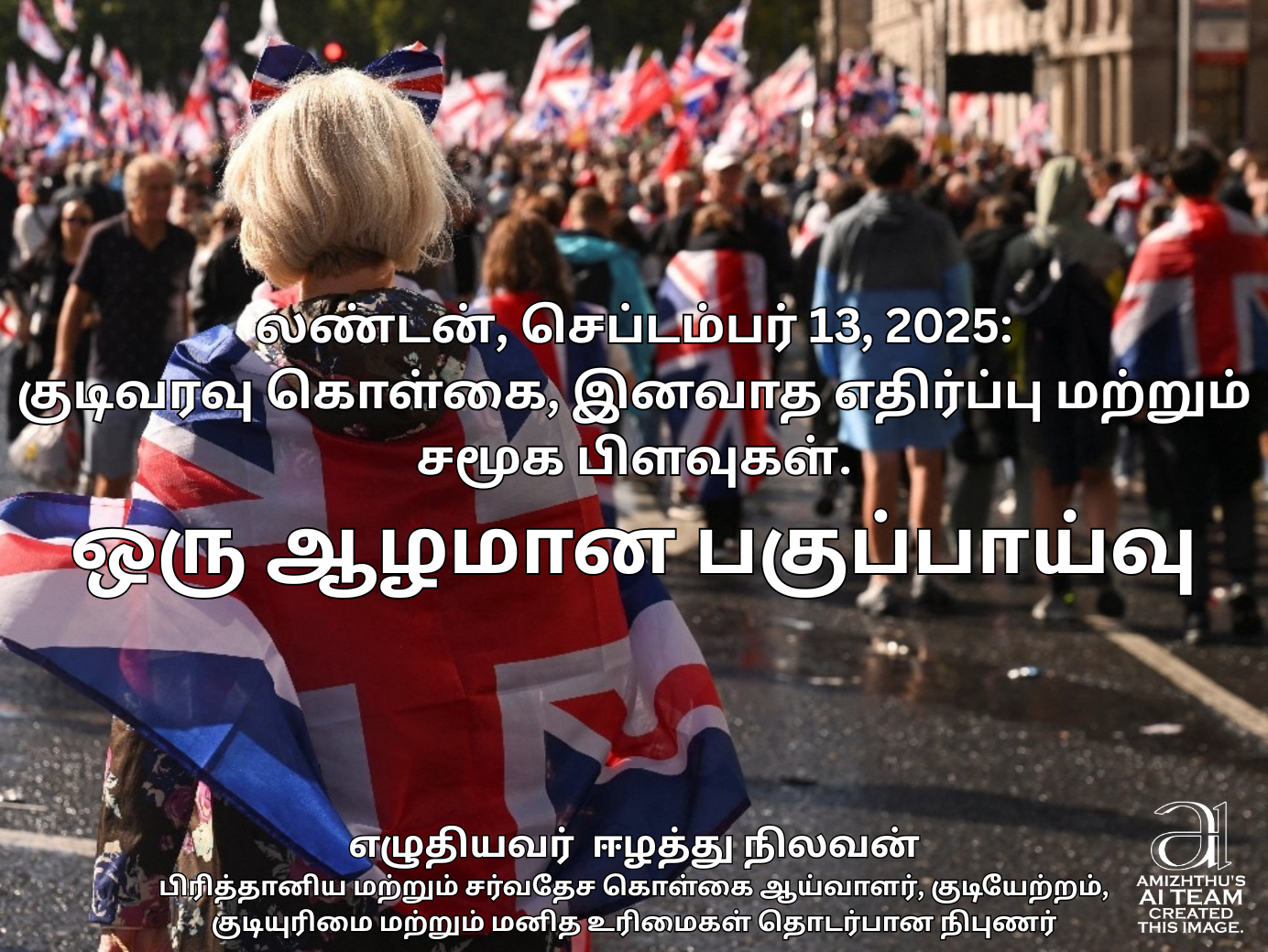 செப்டம்பர் 13, 2025 அன்று லண்டனின் நிகழ்வுகள், குடிவரவு, தேசிய அடையாளம் மற்றும் அரசியல் கருத்தியல் சுற்றியுள்ள இங்கிலாந்தின் நடப்பு சமூக பதட்டங்களை வலியுறுத்துகின்றன. “யுனைட் தி கிங்டம்” ஊர்வலம் உயரும் தேசியவாத உணர்வு மற்றும் தீவிர வலதுசாரி செயல்பாட்டை எடுத்துக்காட்டியது, அதே நேரத்தில் “ஸ்டேண்ட் அப் டு ரேசிசம்” எதிர்ப்பு சமத்துவம் மற்றும் இனவாத எதிர்ப்பு கோட்பாடுகளுக்கான உறுதியான அர்ப்பணிப்பை நிரூபித்தது.