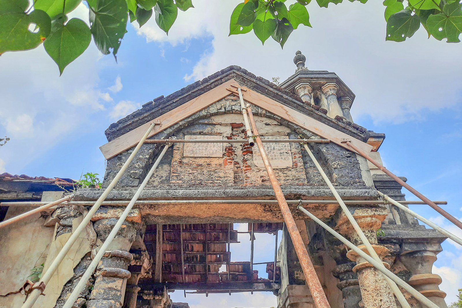 அந்தக் கட்டடம் உடைந்து விழும் நிலையில் காணப்பட்டிருந்ததால், அதற்கு முட்டுக்கொடுத்து கம்பிகள் நடப்பட்டிருந்தன.