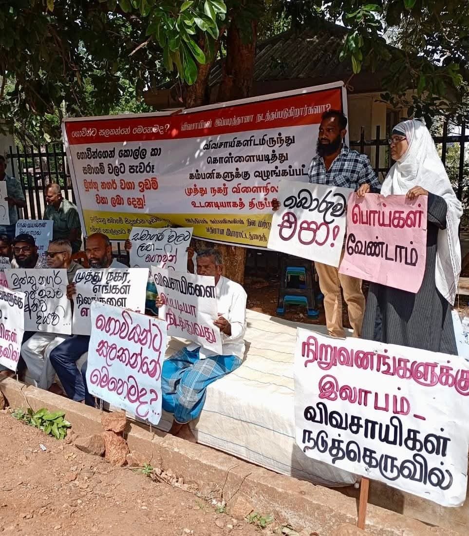 “விவசாயிகளிடமிருந்து கொள்ளையடித்து கம்பனிகளுக்கு வழங்கப்பட்ட முத்து நகர் விளைநிலங்களை உடனடியாகத் திருப்பிக் கொடு!”, “இந்தியக் கம்பனிகளின் நில மற்றும் வளச் சூறையாடலுக்கு எதிரான போராட்டத்தைத் தொடங்குவோம்!”, “பொய்கள் வேண்டாம்”, “விவசாயிகளை இப்படியா நடாத்துவது” போன்ற வாசகங்கள் அடங்கிய பதாதைகளை ஏந்தியவாறு முத்து நகர் விவசாயிகள் மற்றும் மக்கள் போராட்ட இயக்கம், அகில இலங்கை விவசாய சம்மேளன பிரதிநிதிகள் இணைந்து போராட்டத்தை முன்னெடுத்து வருகின்றனர்.
