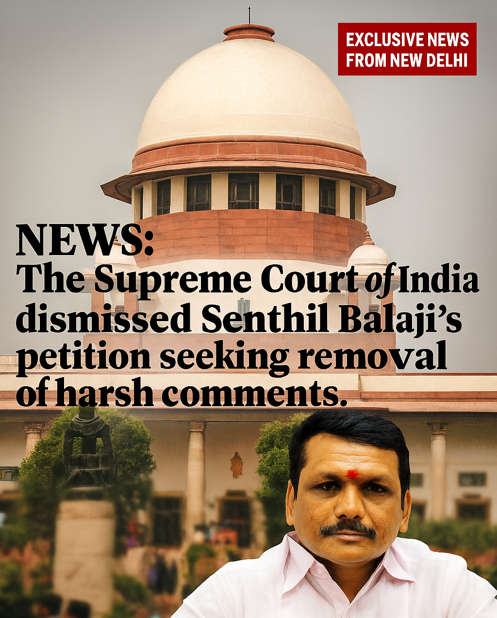 தனக்கு எதிரான வழக்கில், சுப்ரீம் கோர்ட் தெரிவித்த சில கடுமையான கருத்துக்களை நீக்க வேண்டும் என்று கோரி, முன்னாள் அமைச்சர் செந்தில் பாலாஜி தாக்கல் செய்த மனுவை இரண்டு நீதிபதிகள் கொண்ட பெஞ்ச் தள்ளுபடி செய்தது.