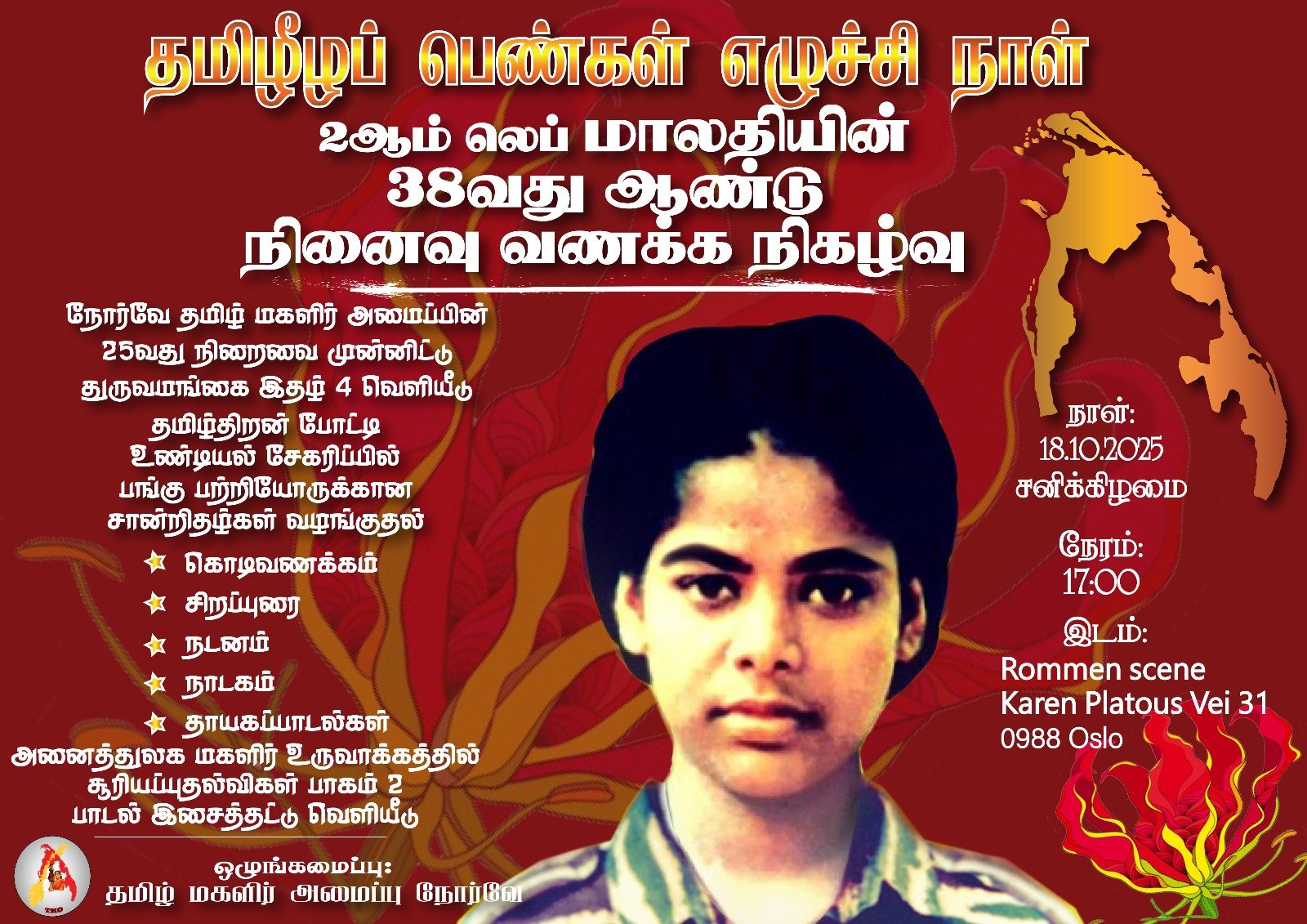 ஐரோப்பாநிகழ்வுகள்புலம்பெயர் தமிழர்கள் தமிழீழப் பெண்கள் எழிச்சி நாள் 2025 – நோர்வே written by 8 October 2025 0 comments 0FacebookTwitterPinterestEmail 12 தமிழீழப் பெண்கள் எழிச்சி நாள் 2025 – நோர்வே பகிரவும் Print (Opens in new window) Print Share on WhatsApp (Opens in new window) WhatsApp Post Share on Telegram (Opens in new window) Telegram Email a link to a friend (Opens in new window) Email Share on Tumblr Share on Threads (Opens in new window) Threads Like this:Like Loading... Related Tamil Diaspora - புலம்பெயர் தமிழர்கள் 0 FacebookTwitterPinterestEmail Amizhthu previous post 2’ம் லெப் மாலதி 38’ம் ஆண்டு நினைவு நாளும்! தமிழீழப் பெண்கள் எழுச்சி நாளும்! – பிரித்தானியா next post தமிழீழப் பெண்கள் எழுச்சி நாள் 2025 – டென்மார்க் Leave a ReplyCancel reply