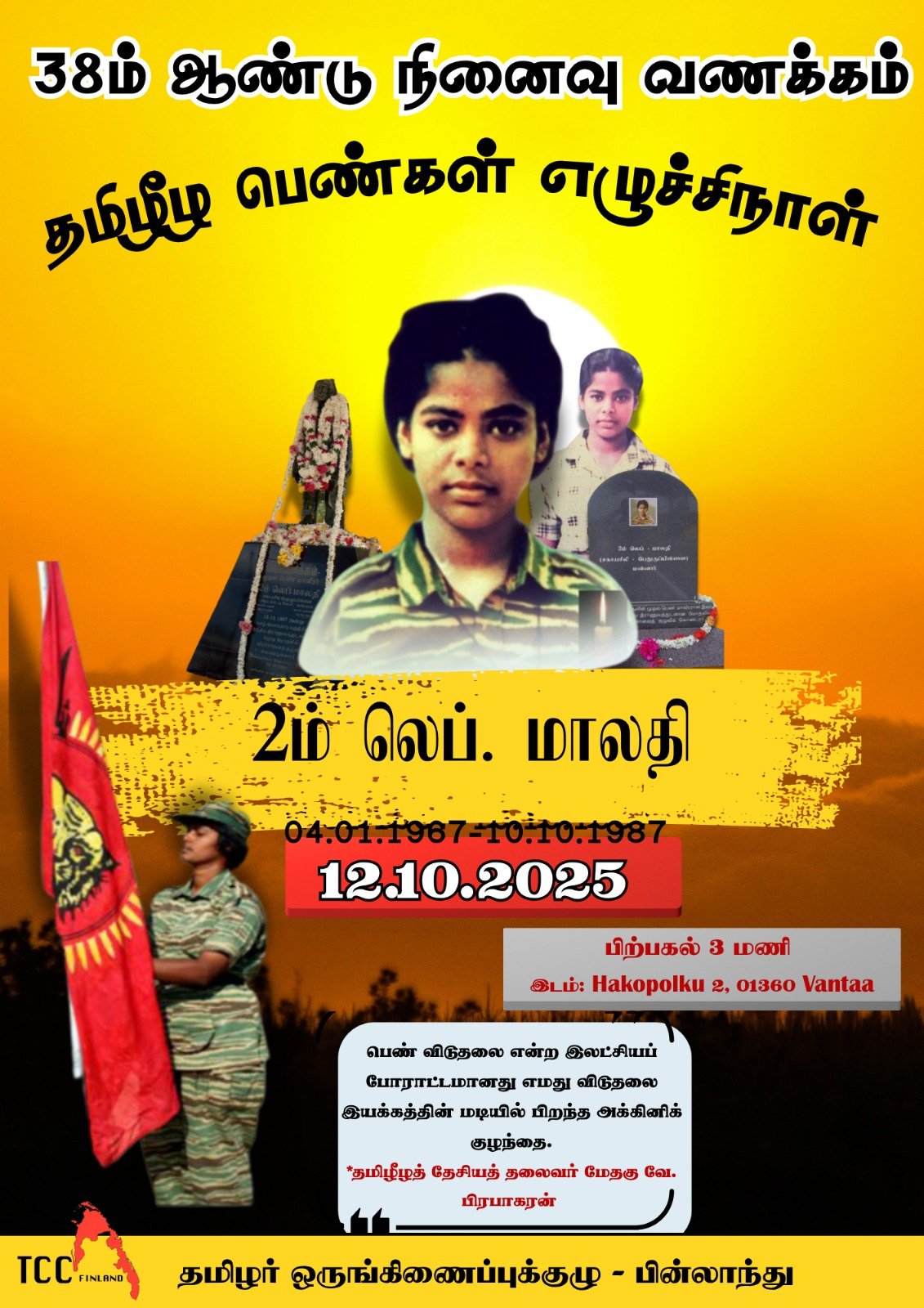 நிகழ்வுகள்புலம்பெயர் தமிழர்கள் தமிழீழப் பெண்கள் எழுச்சி நாள் 2025 – பின்லாந்து written by 8 October 2025 0 comments 0FacebookTwitterPinterestEmail 11 தமிழீழப் பெண்கள் எழுச்சி நாள் 2025 – பின்லாந்து பகிரவும் Print (Opens in new window) Print Share on WhatsApp (Opens in new window) WhatsApp Post Share on Telegram (Opens in new window) Telegram Email a link to a friend (Opens in new window) Email Share on Tumblr Share on Threads (Opens in new window) Threads Like this:Like Loading... Related Tamil Diaspora - புலம்பெயர் தமிழர்கள் 0 FacebookTwitterPinterestEmail Amizhthu previous post தமிழீழப் பெண்கள் எழுச்சி நாள் 2025 – யேர்மனி next post இலங்கை வானிலை அறிக்கை Leave a ReplyCancel reply