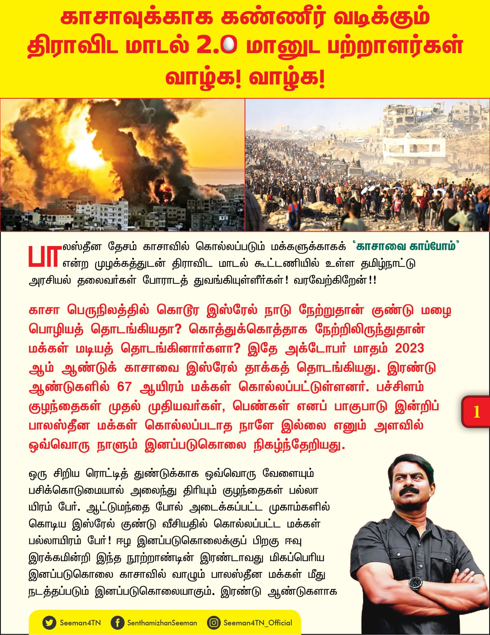 ஆப்ரேசன் சிந்தூர் என்று மக்கள் வாழும் பகுதிகள் மீது குண்டு வீசி போர்தொடுத்த போது அதனை வரவேற்று முதலமைச்சர் தலைமையில் பேரணி நடத்திய திராவிட மாடல் திமுக அரசு, மணிப்பூர் கலவரத்தில் கொல்லப்பட்ட மக்களுக்காக எந்தப் பேரணியும் நடத்தவில்லை. இருப்பினும் இன்றைக்குக் காசாவுக்காகக் கண்ணீர் வடிக்கிறீர்கள்! வரவேற்கிறோம்! இதேபோல 2009 இல் அருகிலிருக்கும் ஈழத்தாயகத்தில் கொடும்போரை நிகழ்த்தி இனவெறி சிங்கள அரசு இலட்சக்கணக்கில் எம்மினச்சொந்தங்களைக் கொன்று குவிக்கும்போது உங்கள் கண்கள் குருடாகி இருந்ததா?, அங்கே அலறிய மக்களின் குரல் விழாத அளவிற்கு உங்கள் காதுகள் செவிடாகிப் போயிருந்ததா? அன்றைக்கு நாங்கள் வடித்த கண்ணீர், சிந்திய ரத்தம், செத்து விழுந்த உடல்கள் உங்கள் கண்களுக்குத் தெரியவில்லையா? கதறிய கதறல்கள் உங்கள் காதுகளுக்குக் கேட்கவில்லையா?