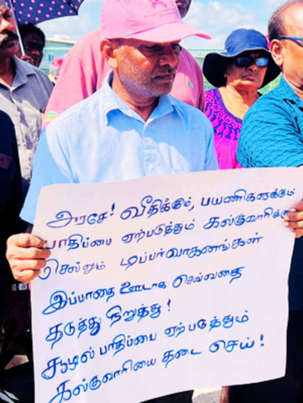 ஓமந்தை வேப்பங்குளம் அரச ஊழியர் வீட்டுத்திட்டத்திட்ட பகுதியில் பாதையால் கனரக வாகனங்கள் செல்வதால் வீதி சேதமடைந்து வருவதாகவும், வீதியால் செல்லும் பொதுமக்களை அச்சுறுத்தும் வகையில் கனரக வாகனங்கள் பயணிப்பதாகவும், வேப்பங்குளம் புகையிரத கடவையில் பாதுகாப்பு ஏற்பாடுகள் எதுவும் இல்லையென தெரிவித்தும் அப்பகுதி மக்கள் சனிக்கிழமை (11.10.2025) கவனயீர்ப்பு போராட்டமொன்றினை நடாத்தினர்.