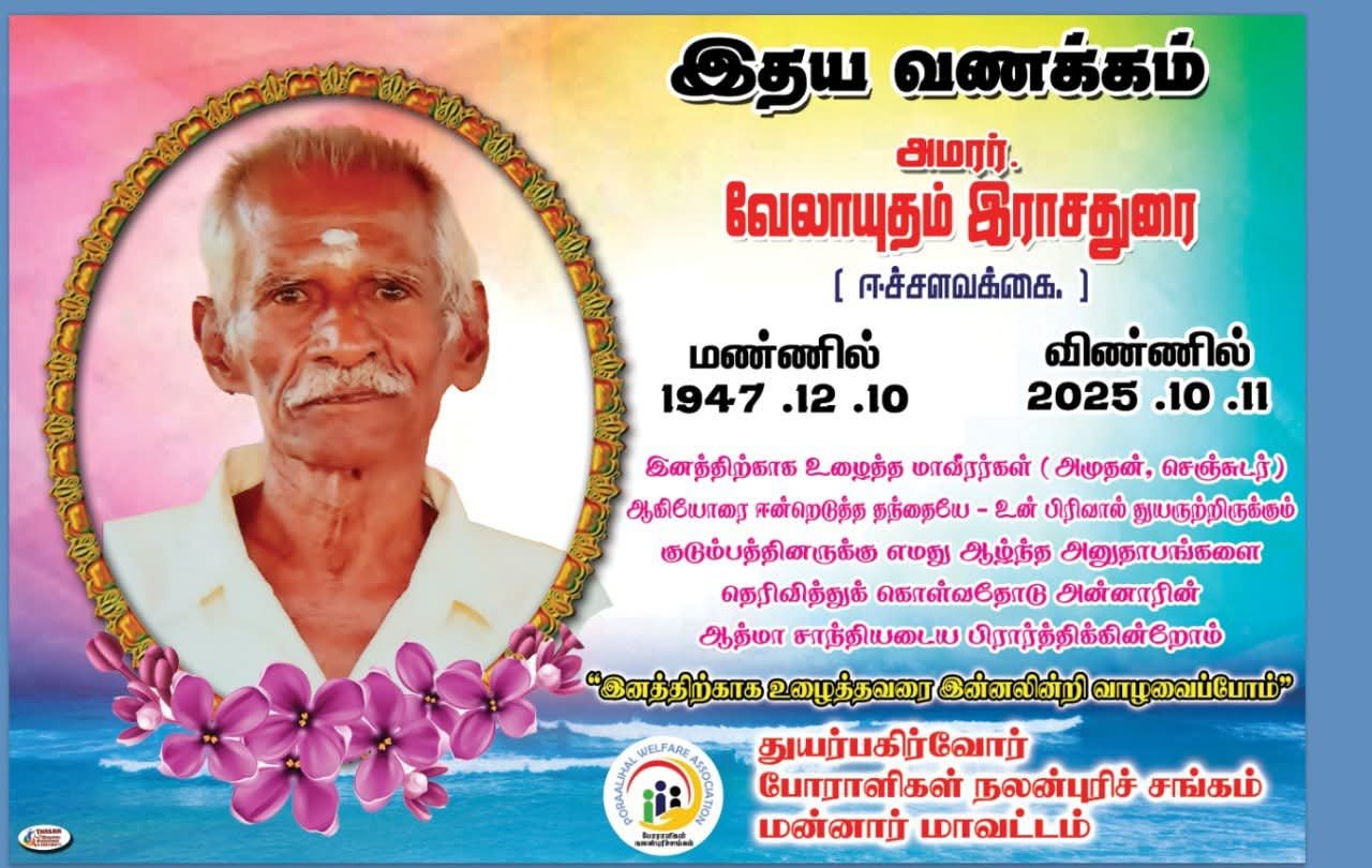 மன்னார் ஈச்சளவக்கையைச் சேர்ந்த “மாவீரர் வீரவேங்கை அமுதன் & மாவீரர்வீரவேங்கை செஞ்சுடர்” ஆகியோரின் தந்தையாரான வேலாயுதம் இராசதுரை அவர்கள் 11.10.2025 (சனிக்கிழமை) இவ்வுலகினை நீத்துள்ளார்.
