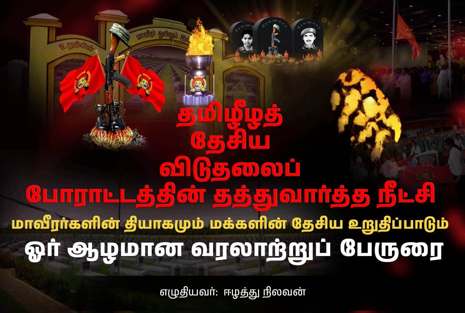 தமிழீழத் தேசிய விடுதலைப் போராட்டம் ஒரு முழுமையான வரலாற்றுச் சகாப்தமாகும். இது ஒரு தேசிய இனத்தின் விழிப்பு, எழுச்சி, தியாகம், மற்றும் தொடரும் வேட்கையைப் பறைசாற்றுகிறது. மாவீரர்களின் இரத்தம் நீரூற்றிய இந்த மண், இலட்சியத்தின் உறைவிடமாக என்றென்றும் இருக்கும்.