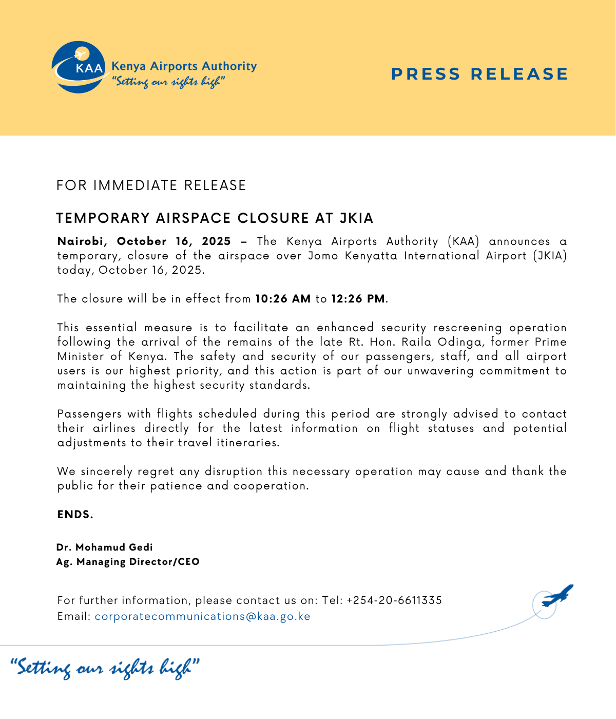 Operations at Nairobi Jomo Kenyatta International Airport are currently suspended due to an ongoing security situation following the arrival of the remains of the late Rt. Hon. Raila Odinga. So far, at least 7 flights have been diverted to other airports.