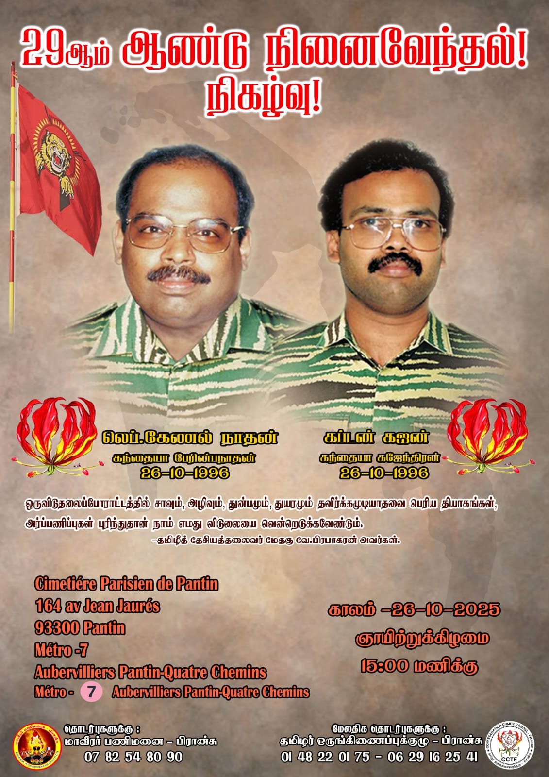 நிகழ்வுகள்புலம்பெயர் தமிழர்கள் லெப்.கேணல் நாதன் & கப்டன் கஜன் ஆகியோரின் 29’ம் ஆண்டு நினைவேந்தல் நிகழ்வு – பிரான்சு written by 20 October 2025 0 comments 0FacebookTwitterPinterestEmail 20 லெப்.கேணல் நாதன் & கப்டன் கஜன் ஆகியோரின் 29’ம் ஆண்டு நினைவேந்தல் நிகழ்வு – பிரான்சு பகிரவும் Print (Opens in new window) Print Share on WhatsApp (Opens in new window) WhatsApp Post Share on Telegram (Opens in new window) Telegram Email a link to a friend (Opens in new window) Email Share on Tumblr Share on Threads (Opens in new window) Threads Like this:Like Loading... Related France - பிரான்சுTamil Diaspora - புலம்பெயர் தமிழர்கள் 0 FacebookTwitterPinterestEmail Amizhthu previous post அகவை வாழ்த்து – அக்டோபர் 20 next post மயில்வாகனம் நிமலராஜன்: உண்மைக்காக உயிர்நீத்த ஊடக வீரர் Leave a ReplyCancel reply