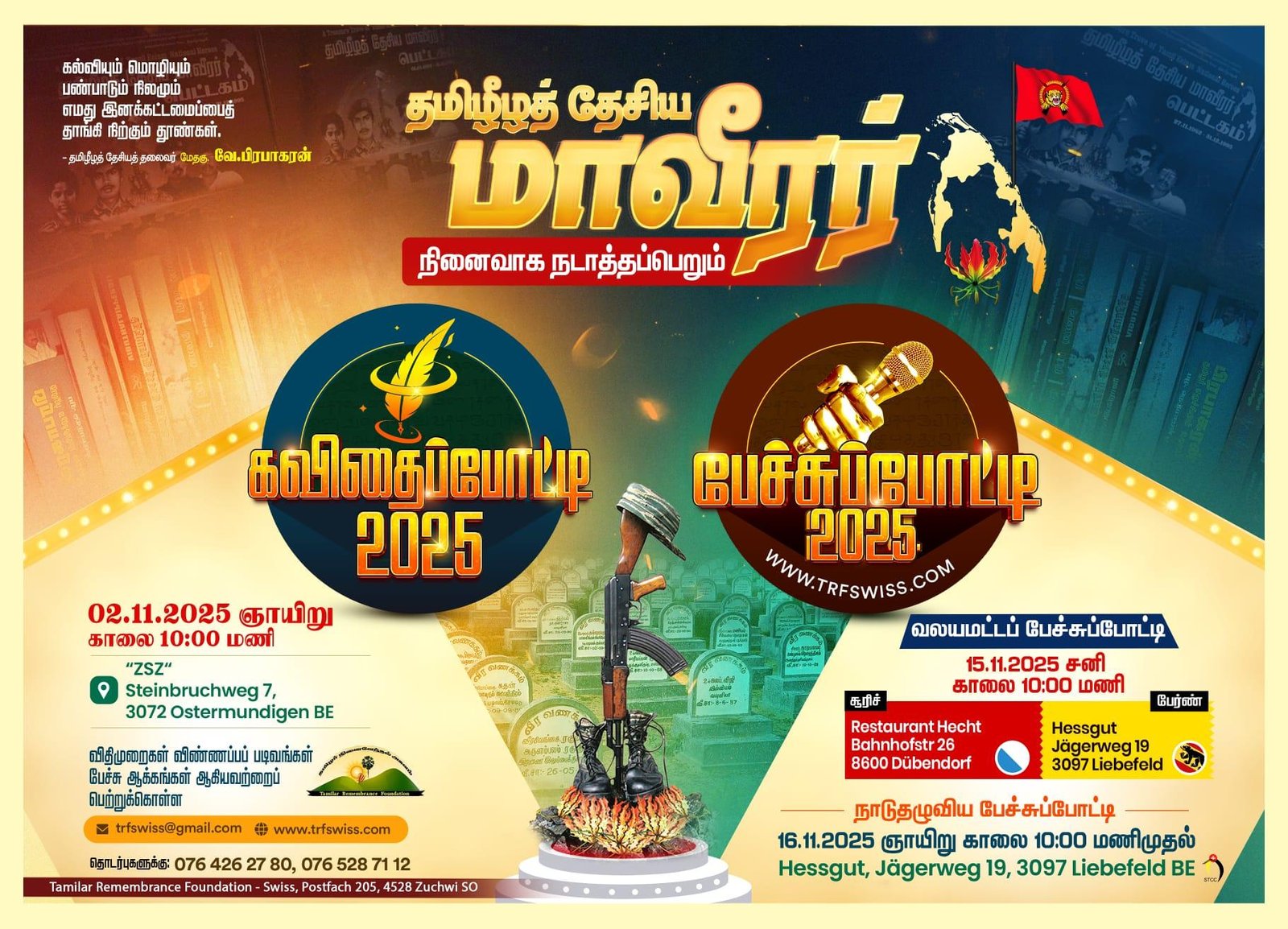 நிகழ்வுகள்புலம்பெயர் தமிழர்கள்முதன்மை செய்திகள் தமிழீழத் தேசிய மாவீரர் நினைவாக நடாத்தப்பெறும் கவிதைப்போட்டி & பேச்சுப்போட்டி 2025 – சுவிஸ் written by 21 October 2025 0 comments 0FacebookTwitterPinterestEmail 28 தமிழீழத் தேசிய மாவீரர் நினைவாக நடாத்தப்பெறும் கவிதைப்போட்டி & பேச்சுப்போட்டி 2025 தமிழீழத் தேசிய மாவீரர் நினைவாக நடாத்தப்பெறும் கவிதைப்போட்டி & பேச்சுப்போட்டி 2025 பகிரவும் Print (Opens in new window) Print Share on WhatsApp (Opens in new window) WhatsApp Post Share on Telegram (Opens in new window) Telegram Email a link to a friend (Opens in new window) Email Share on Tumblr Share on Threads (Opens in new window) Threads Like this:Like Loading... Related Swiss -சுவிஸ்Tamil Diaspora - புலம்பெயர் தமிழர்கள் 0 FacebookTwitterPinterestEmail Amizhthu previous post அகவை வாழ்த்து – அக்டோபர் 21 next post தமிழ்நாட்டின் 8 மாவட்டங்களுக்கு இன்று ரெட் அலர்ட் விடுக்கப்பட்டுள்ளதாக சென்னை வானிலை ஆய்வு மையம் அறிவித்துள்ளது. Leave a ReplyCancel reply