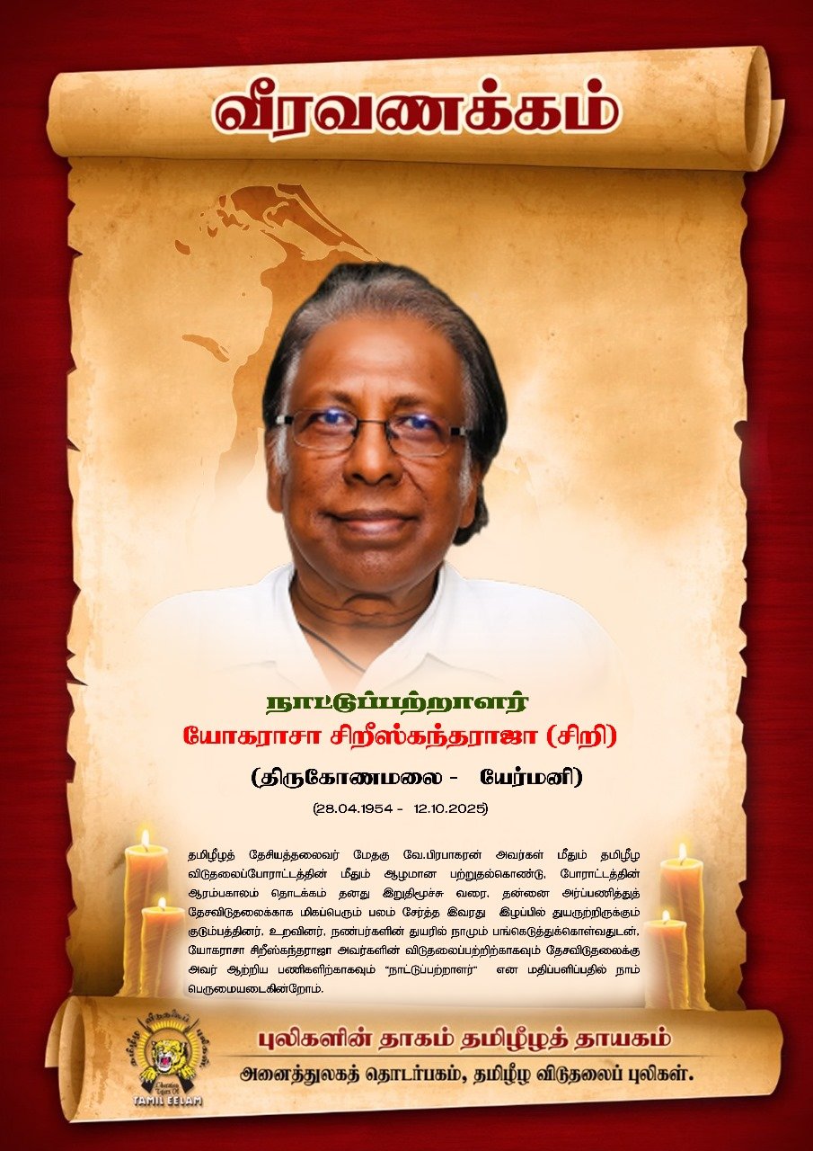 தமிழீழப்பற்றோடும் தாய்மொழிப்பற்றோடும் தனது இறுதிமூச்சுவரை தமிழீழ விடுதலைக்காய்ப் பணியாற்றிய யோகராசா சிறீஸ்கந்தராஜா அவர்கள், 12.10.2025 அன்று உடல்நலக்குறைவினால் சாவடைந்தார் என்ற செய்தி எமக்குப் பெருந்துயரினை ஏற்படுத்தியுள்ளது.