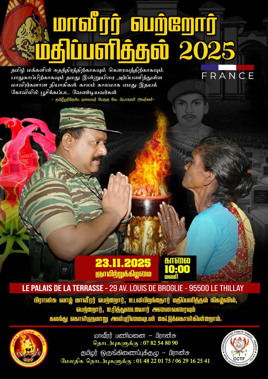 ஐரோப்பாசர்வதேசச் செய்திகள்நிகழ்வுகள்புலம்பெயர் தமிழர்கள் மாவீரர் பெற்றோர் மதிப்பளித்தல் 2025 – பிரான்சு written by 25 October 2025 0 comments 0FacebookTwitterPinterestEmail 16 மாவீரர் பெற்றோர் மதிப்பளித்தல் 2025 – பிரான்சு பகிரவும் Print (Opens in new window) Print Share on WhatsApp (Opens in new window) WhatsApp Post Share on Telegram (Opens in new window) Telegram Email a link to a friend (Opens in new window) Email Share on Tumblr Share on Threads (Opens in new window) Threads Like this:Like Loading... Related France - பிரான்சுTamil Diaspora - புலம்பெயர் தமிழர்கள் 0 FacebookTwitterPinterestEmail Amizhthu previous post இலங்கையின் நானுஓயாவில் ஒரு வீடு உடைக்கப்பட்டு, தங்க நகைகள் மற்றும் பணம் கொள்ளை. next post தங்க முலாம் பூசப்பட்ட புத்தர் சிலைகள் மற்றும் ஐஸ் போதைப்பொருளுடன் இரண்டு சந்தேக நபர்கள் கைது Leave a ReplyCancel reply