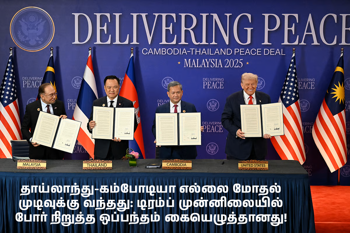 அமெரிக்க அதிபர் டொனால்டு டிரம்ப் முன்னிலையில், தாய்லாந்து – கம்போடியா இடையே போர் நிறுத்த ஒப்பந்தம் இன்று கையெழுத்தானது.