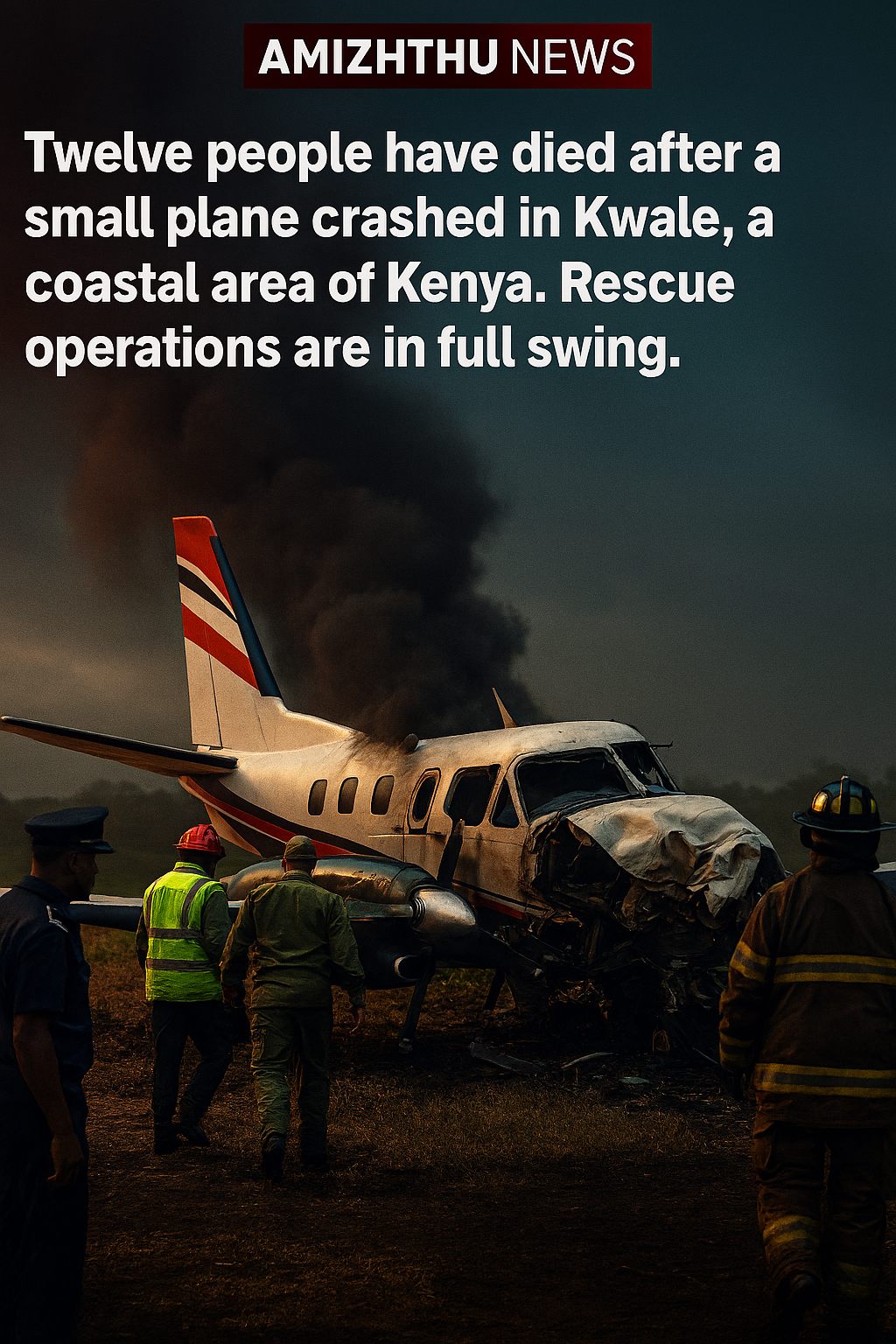 கென்யாவின் கடலோர பகுதியான குவாலேயில் சிறிய ரக விமானம் விபத்தில் சிக்கியதில் 12 பேர் உயிரிழந்தனர். மீட்பு பணிகள் முழு வீச்சில் நடக்கின்றன.