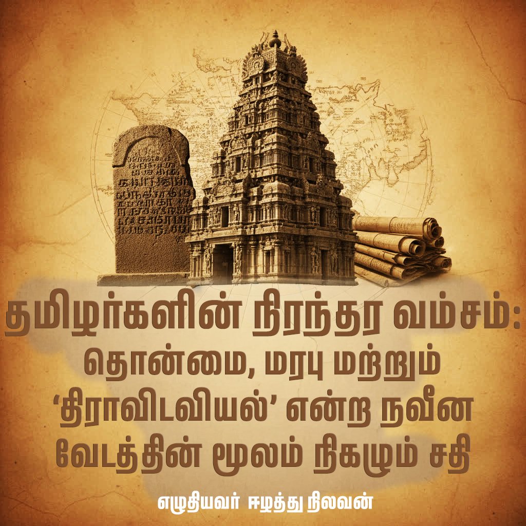 தமிழர் வரலாறு ஒரு தனித்துவமான, சுயநிறைவு பெற்ற நாகரிகத்தை வெளிப்படுத்துகின்றது. ஆனால், நவீன அரசியல், அந்த அடையாளத்தை ‘திராவிடவியல்’ என்ற செயற்கை அரசியல் குடையின் கீழ் மாற்ற முயல்கிறது.
