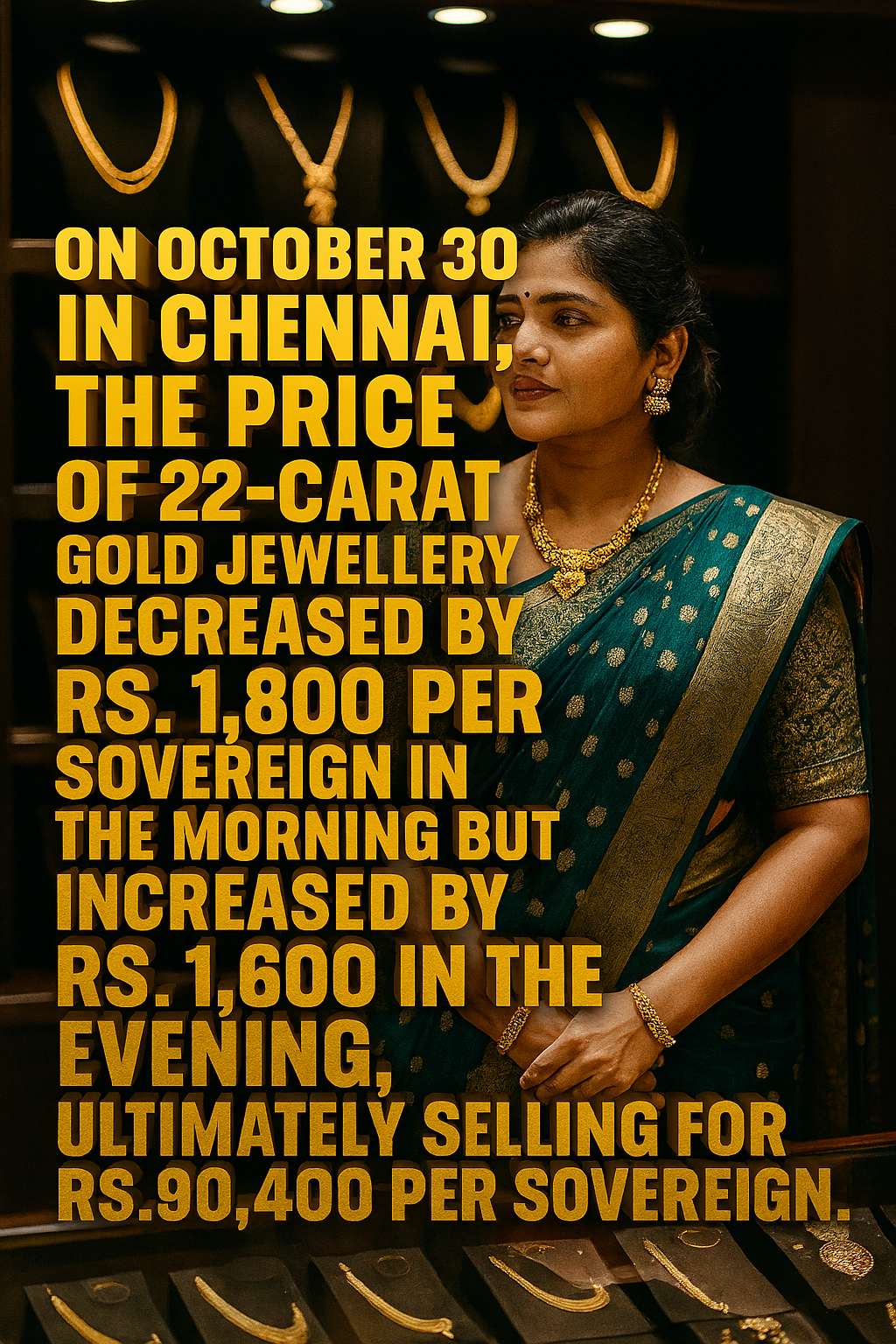 அக்டோபர் 30 ஆம் தேதி சென்னையில், காலையில் 22 காரட் தங்க நகைகளின் விலை சவரனுக்கு ரூ.1,800 குறைந்து, மாலையில் ரூ.1,600 அதிகரித்து, இறுதியில் சவரனுக்கு ரூ.90,400க்கு விற்பனையானது.