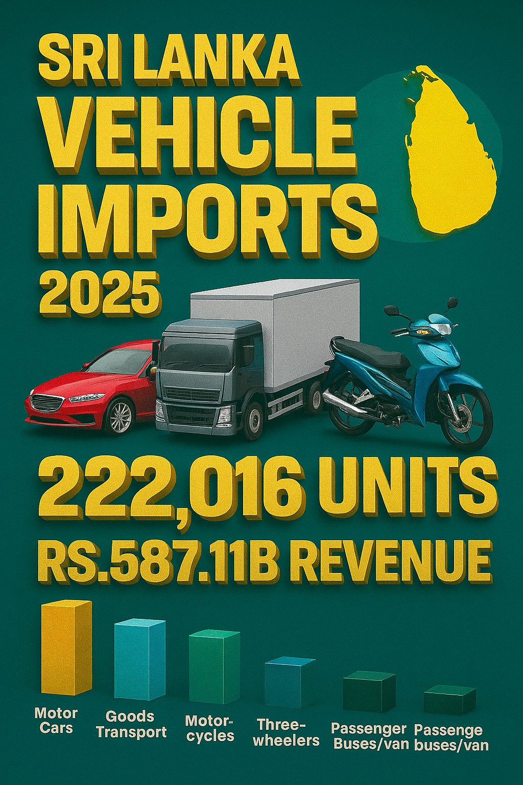 அதேபோல் 7331 பண்ட விநியோக வாகனங்கள் இறக்குமதி செய்யப்பட்டு 48.67 பில்லியன் ரூபாய், 142,524 மோட்டார் சைக்கிள்கள் இறக்குமதி செய்யப்பட்டு 30.37 பில்லியன் ரூபாய், 15,035 முச்சக்கர வண்டிகள் இறக்குமதி செய்யப்பட்டு 15.10 பில்லியன் ரூபாய்,1676 பேருந்துகள் மற்றும் வேன்கள் இறக்குமதி செய்யப்பட்டு 12.66 பில்லியன் ரூபாய் சுங்க வரி வருமானம் பெற்றுக்கொள்ளப்பட்டுள்ளது.