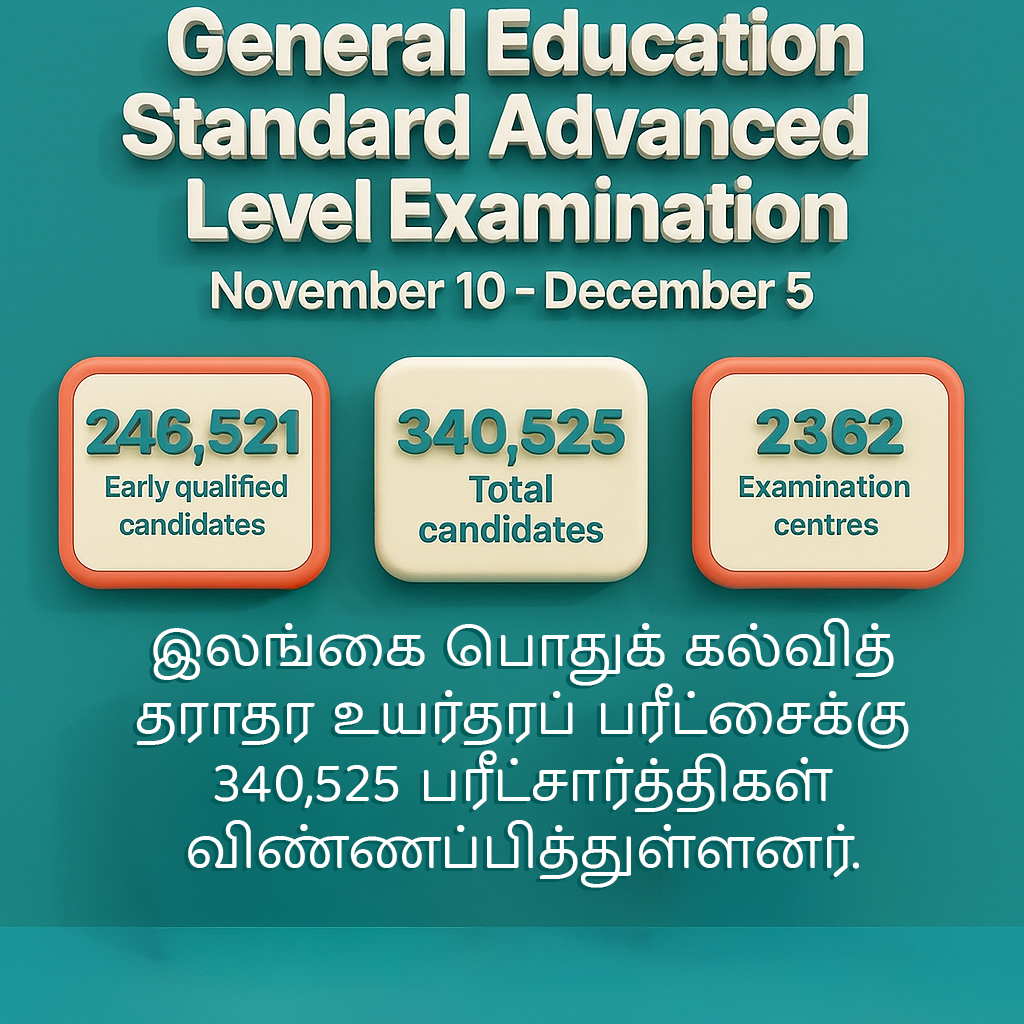 கல்விப் பொதுத் தராதர உயர்தர பரீட்சைகள் எதிர்வரும் 10ஆம் திகதி ஆரம்பமாகி, டிசம்பர் 5ஆம் திகதி வரை இடம்பெறவுள்ளது. 246,521 பரீட்சாத்திகள் பாடசாலை ஊடாகவும், 94,004 பரீட்சாத்திகள் தனிப்பட்ட ரீதியிலும் பரீட்சைக்காக விண்ணப்பித்துள்ளனர். அதற்கமைய ஒட்டுமொத்த விண்ணப்பதாரர்கள் எண்ணிக்கை 340,525 ஆகும்.