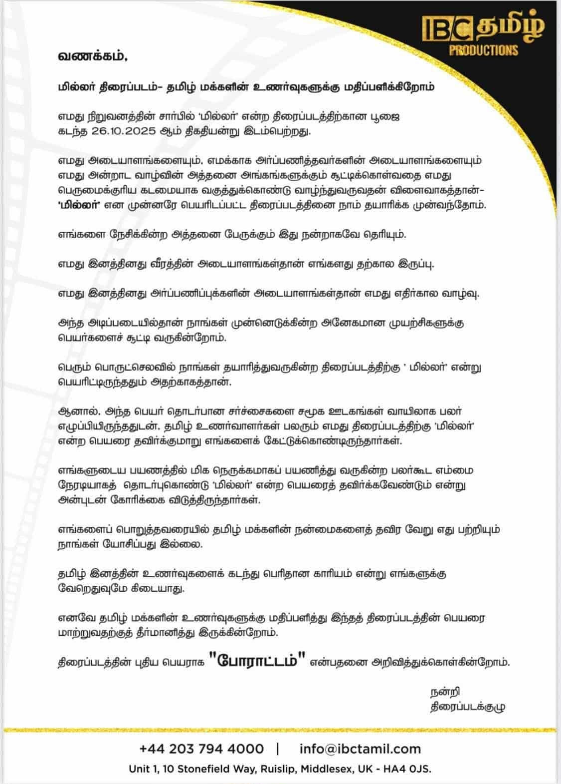 26.10.2025 அன்று வெளியிடப்பட்ட “மில்லர்” எனும் திரைப்படத்தின் பெயரைச் சுற்றிய எழுந்த தமிழர் எதிர்ப்புகள், உலகம் முழுவதும் பரவியுள்ள தமிழ் மக்களின் ஒற்றுமையையும் விழிப்புணர்வையும் மீண்டும் உறுதிப்படுத்தியுள்ளன.