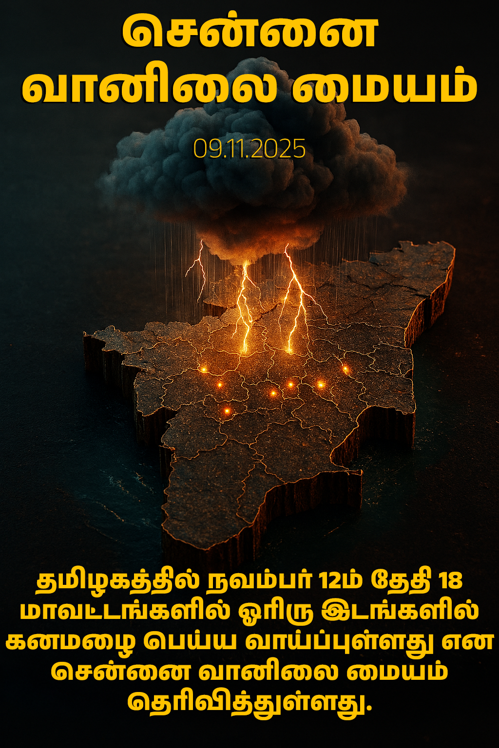திருநெல்வேலி, கன்னியாகுமரி, தென்காசி, தூத்துக்குடி, விருதுநகர், சிவகங்கை, ராமநாதபுரம், தேனி, மதுரை, திண்டுக்கல், திருப்பூர், கோவை, நீலகிரி, தஞ்சை, நாகை, திருவாரூர், மயிலாடுதுறை, புதுக்கோட்டை ஆகிய 18 மாவட்டங்களில் நவ.12ம் தேதி கனமழை பெய்ய வாய்ப்புள்ளது.