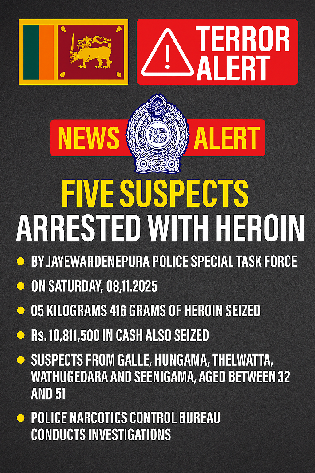 அவர்களிடமிருந்து 05 கிலோ கிராம் 416 கிராம் ஹெரோயின் போதைப்பொருள் கைப்பற்றப்பட்டுள்ளது.