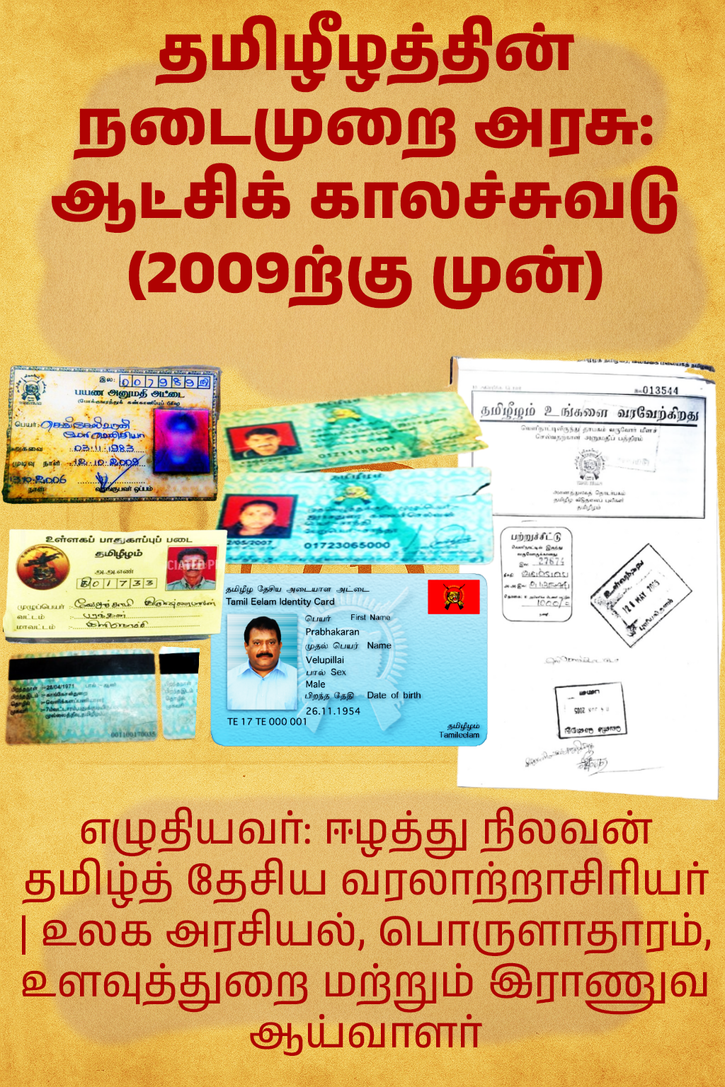 2009 ஆம் ஆண்டுக்கு முந்தைய காலப்பகுதியில், தமிழீழ விடுதலைப் புலிகளின் சிவில் நிர்வாக அமைப்பு தீவின் வடக்கிலும் கிழக்கிலும் விரிவாகச் செயல்பட்டது. இதன் மூலம் தமிழீழம் என அழைக்கப்படும் ஒரு முழுமையான நடைமுறை அரசு உருவானது. இது வெறும் கிளர்ச்சி இயக்கத்தின் வரையறையைத் தாண்டி, ஒரு வழக்கமான அரசின் அனைத்து கூறுகளையும் பிரதிபலிக்கும் நிறுவனங்களை உருவாக்கியது. இதன் அடிப்படை தமிழினத்தின் சுயநிர்ணயக் கொள்கை மற்றும் கூட்டு நிர்வாகத்தின் இலக்கு ஆகும்.