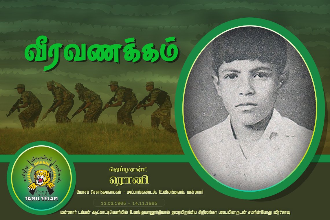 14.11.1985 அன்று ஆட்காட்டிவெளி பகுதியில் உலங்குவானூர்தியால் தரையிறங்கிய சிறிலங்கா படையினருடன் சமரின்போது வீரச்சாவு
