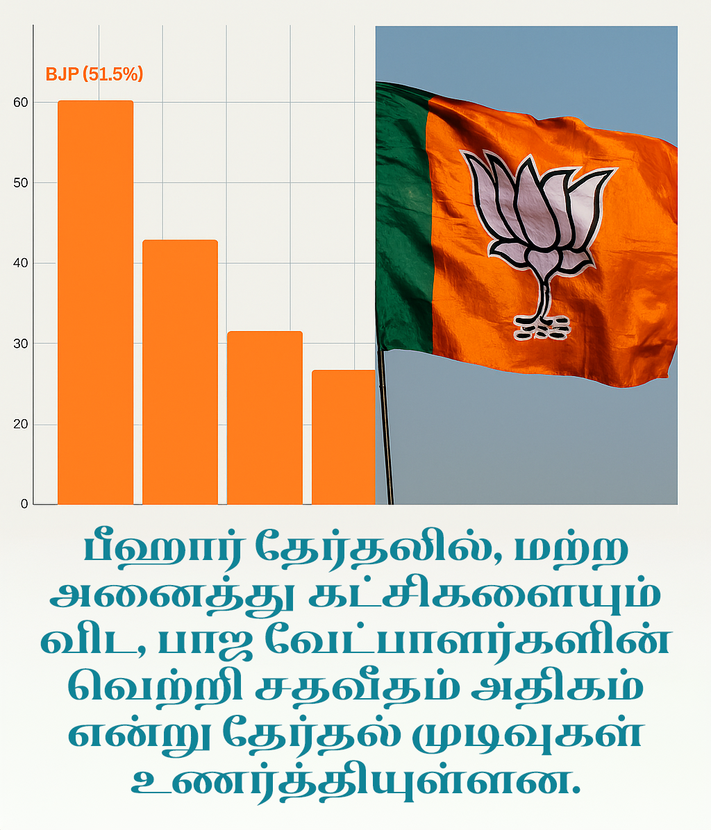 பீஹார் மாநில சட்டசபை தேர்தலில் பா.ஜ.,- ஐக்கிய ஜனதாதளம், சிராக் பாஸ்வானின் லோக்ஜன் சக்தி உள்ளிட்ட கட்சிகள் தேஜ கூட்டணியில் போட்டியிட்டன. இதில் மற்ற அனைத்து கட்சிகளையும் விட, பாஜவின் வெற்றி- முன்னிலை சதவீதம் அதிகமாக இருப்பது, அக்கட்சியினரை மகிழ்ச்சி அடையச் செய்துள்ளது.