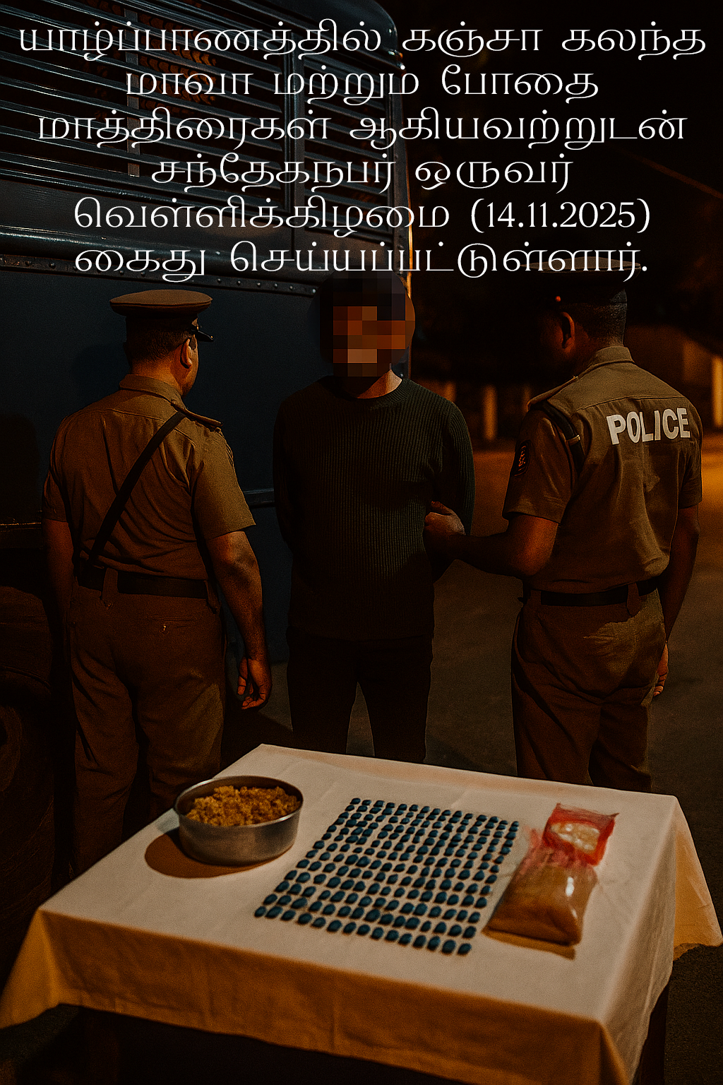 யாழ்ப்பாணம் மாவட்ட சிரேஷ்ட பொலிஸ் அத்தியட்சகரின் கீழ் இயங்கும் பொலிஸ் புலனாய்வு பிரிவினருக்கு கிடைத்த இரகசிய தகவலின் அடிப்படையில், யாழ்ப்பாணம் பொலிஸ் போதைப்பொருள் தடுப்பு பொலிஸாரால் இந்த கைது நடவடிக்கை முன்னெடுக்கப்பட்டது.