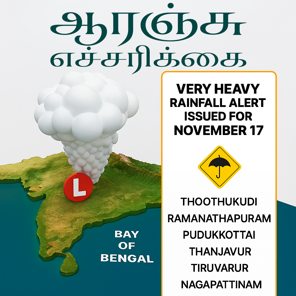 இந்த வளர்ச்சி தென்னிந்தியாவின் சில பகுதிகளுக்கு மிக அதிக மழை பெய்யும் என்று எதிர்பார்க்கப்படுகிறது, இதனால் நவம்பர் 17 அன்று ஆறு மாவட்டங்களுக்கு *ஆரஞ்சு எச்சரிக்கை விடுக்கப்பட்டது.