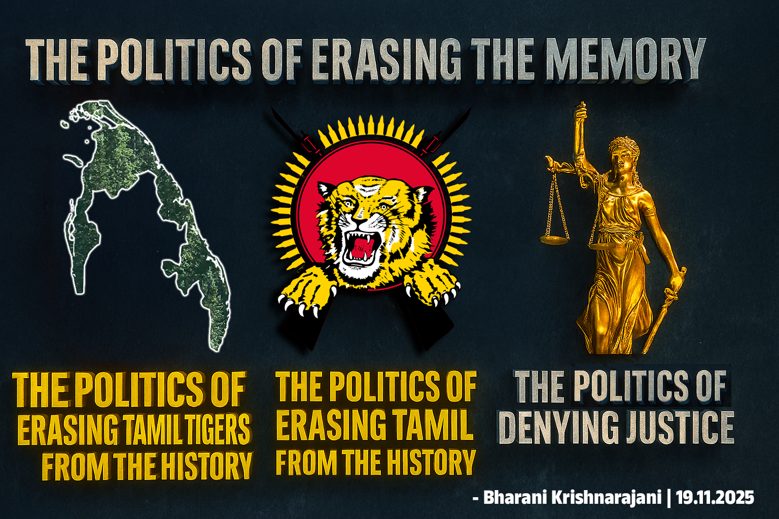 Denying justice to the Tamils is now a seemingly unquestionable overt act. The politics of denying the existence of the Tamil Tigers and their principles are rooted in the politics of erasing this collective memory. The near effortless way in which this politics is practiced is what we define as “the politics of erasing Tamil Tigers from history”.